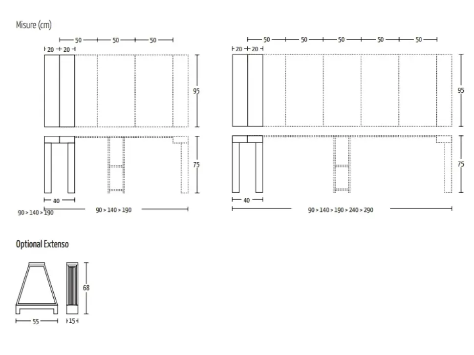 Combi è la consolle sorella di Square, alleggerita nella struttura dalle gambe quadrate, più esili e sottili. Quando è chiusa le allunghe creano un simpatico gioco di ripiani, mentre quando è aperta è un tavolo da pranzo solido e funzionale.