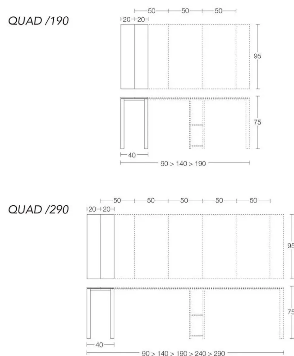- Tipologia consolle allungabile: La consolle Quad altacom è dotata di un meccanismo allungabile, che permette di adattarla alle diverse esigenze di spazio, offrendo una soluzione versatile e funzionale.
