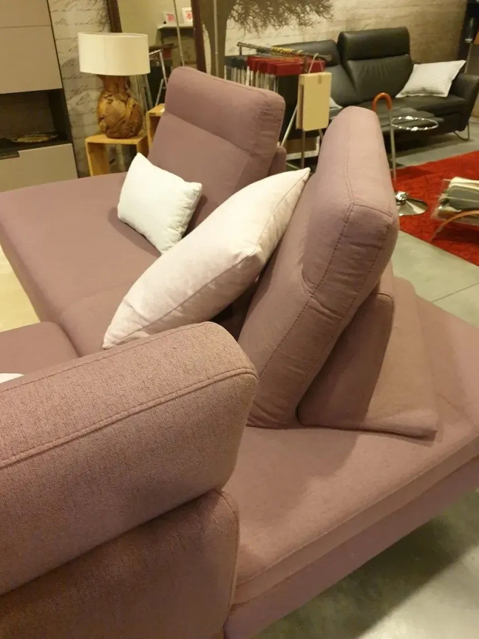 Divano in tessuto , grazie al particolare meccanismo traslante, gli schienali modificano la profondità delle sedute.