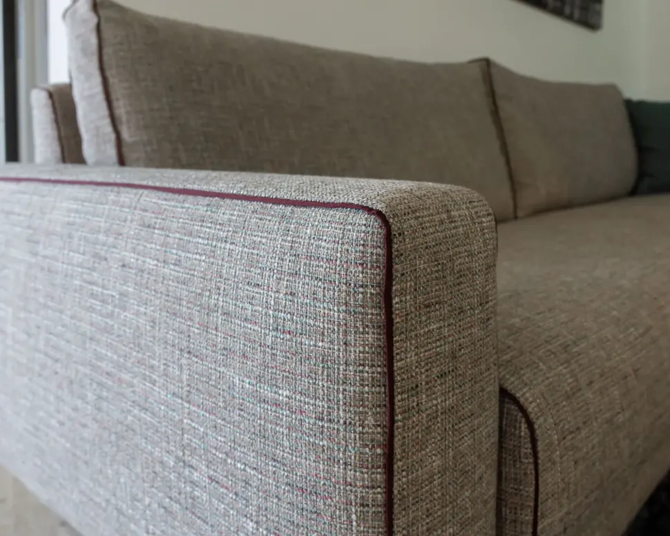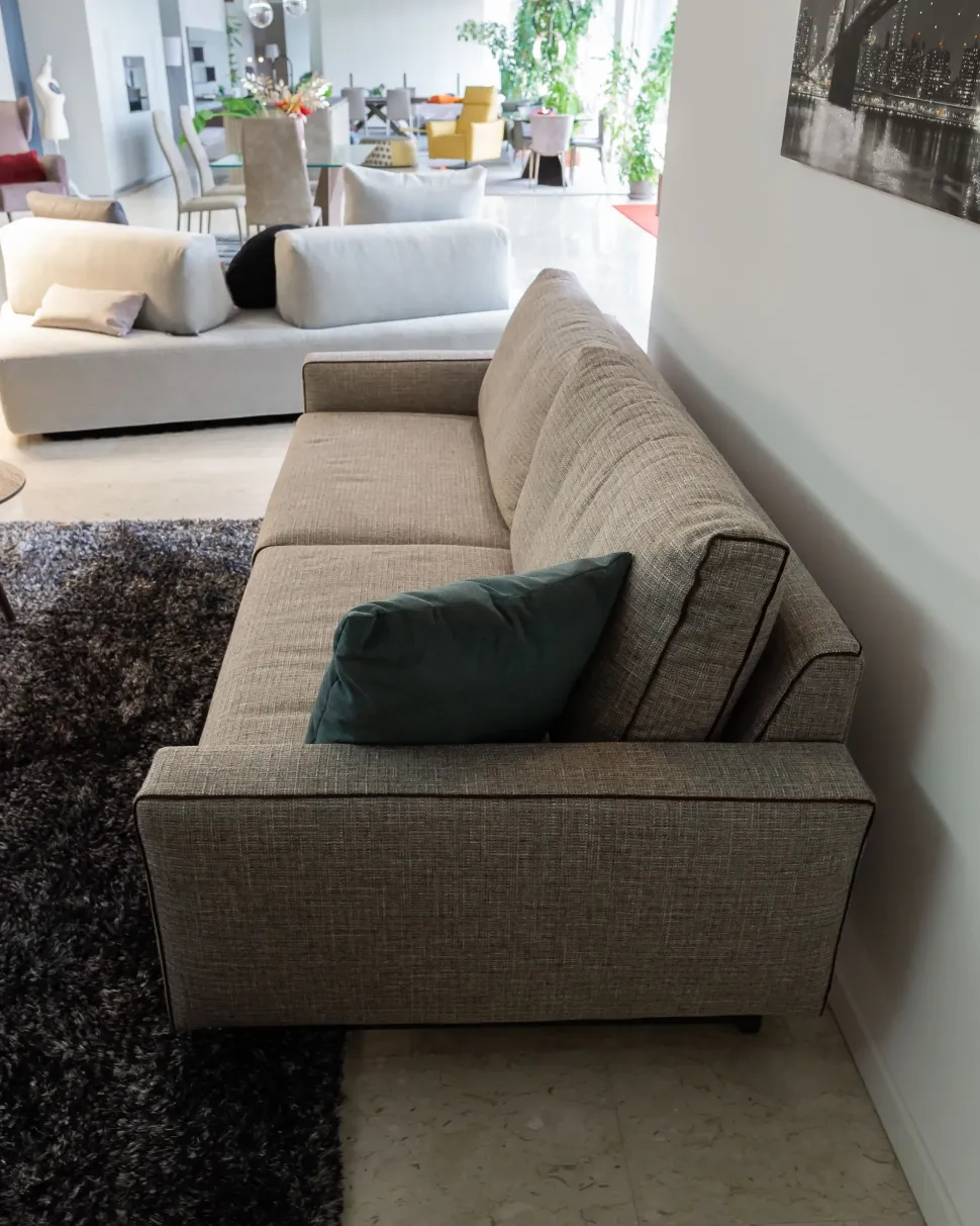 Divano lineare artigianale, alta qualità costruttiva, seduta con supporto in poliuretano espanso ad alta densità, inserto superiore in Memory Form con prefodera in vellutino.