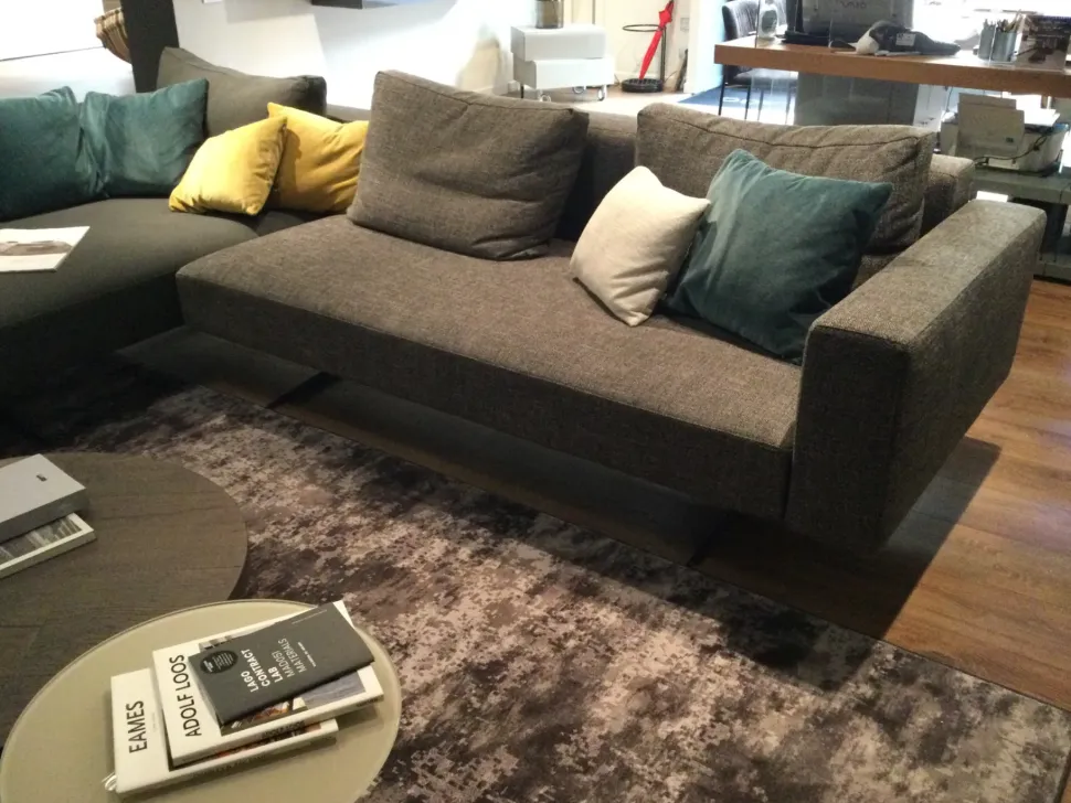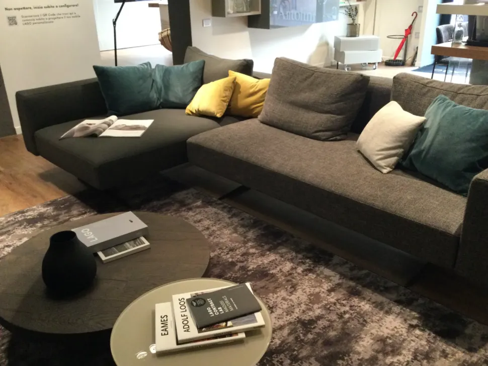 Divano componibile Air di Lago con piede steel peltro con rivestimento in tessuto. Design esclusivo con piede che rende la seduta sollevata da terra per rendere leggero il prodotto è facilitare la pulizia. Completo di cuscini d’arredo come foto.