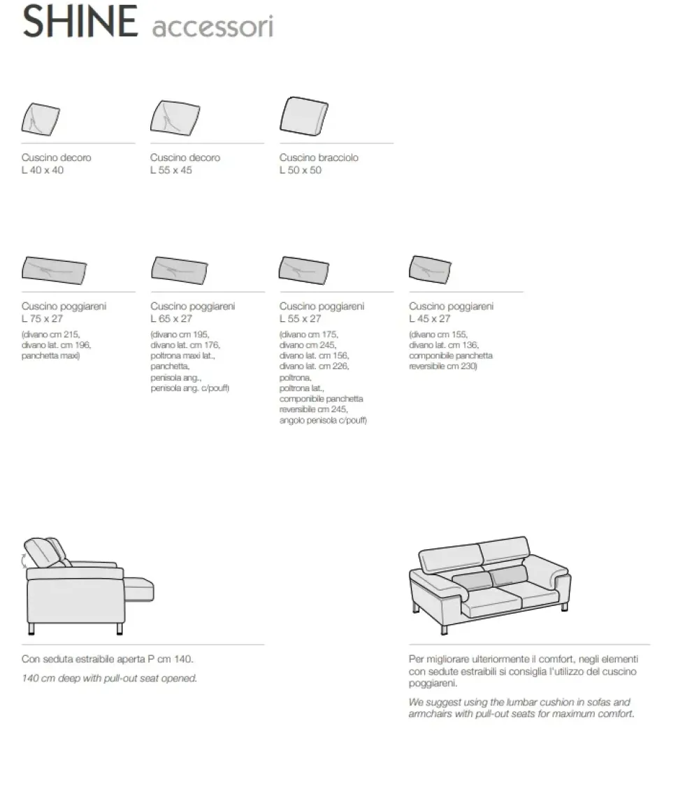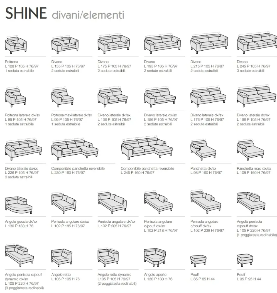 - L’imbottitura di Shine è in poliuretano di grande valore, capace di fondere insieme la tipica sofficità con la resistenza del materiale nel tempo al prolungato utilizzo.