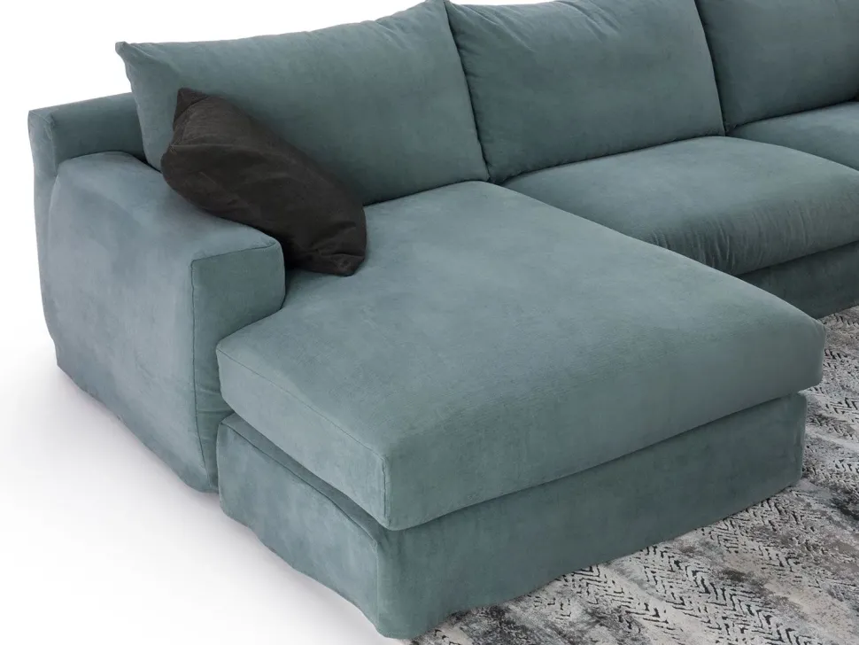Lo stile è contemporaneo, con volumi pieni e generosi: i cuscini di seduta sono abbondanti, imbottiti con espanso e fibra effetto piuma, mentre quelli di schienale sono imbottiti con vera piuma, offrendo morbidezza e comfort. I piedini bassi sono nascosti dalla gonna della fodera, che non è fissata alla struttura del divano, facilitando così la sfoderabilità.