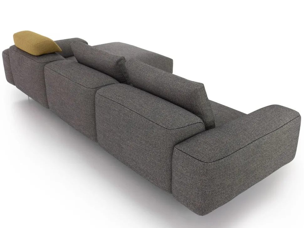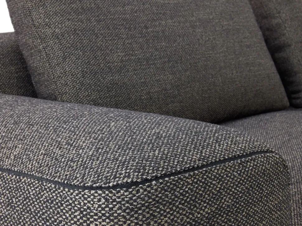 La composizione proposta in outlet è caratterizzata da un elemento lineare con bracciolo e due cuscini di schienale, che ne garantiscono un buon appoggio, mentre la chaise longue è dotata di un poggiatesta per il massimo relax, realizzato con un rivestimento a contrasto. I cuscini, essendo in appoggio, possono essere intercambiati tra loro nel posizionamento.