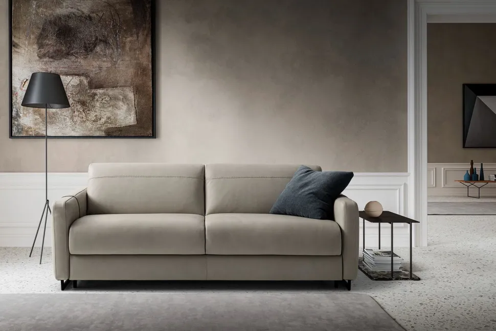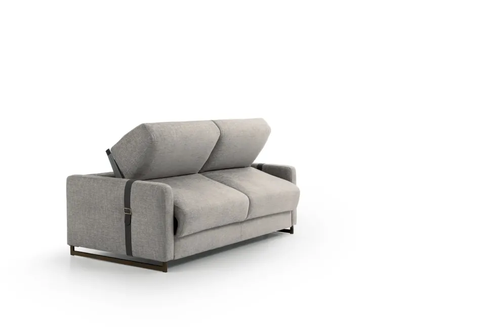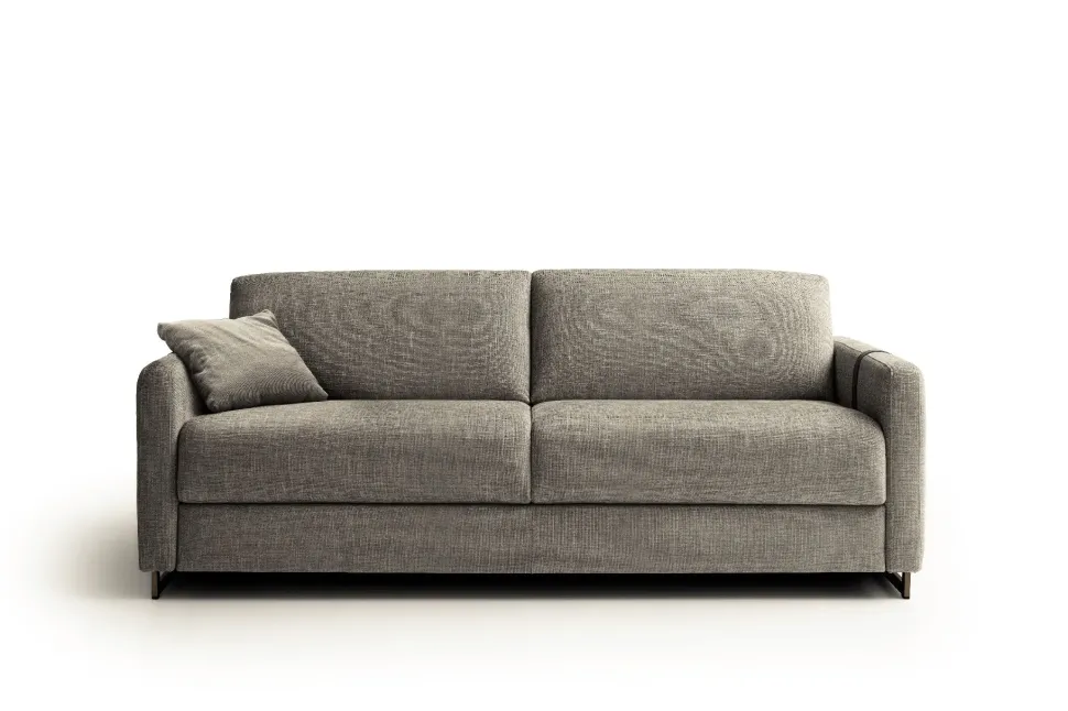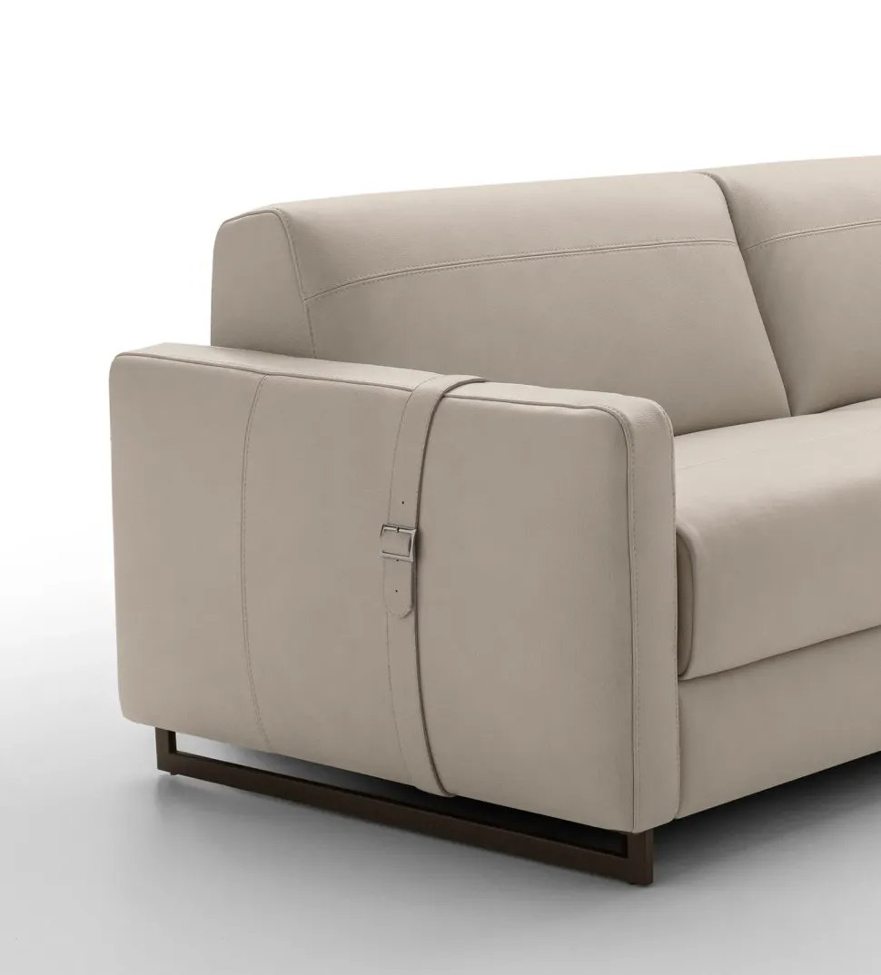 Divano letto dal design semplice e minimale ,invitante e confortevole, Maya si fa apprezzare per il design lineare corredato da piccoli cinturini in pelle che avvolgono gli esili braccioli, elementi caratterizzanti del modello. Dotato di meccanismo a ruote che permette gli spostamenti semplici e veloci. Un insieme di grande effetto e di estrema comodità. Il divano misura L 206 cm P 98 (aperto P 209 cm). Monta una rete da 160 x 195 ed è già dotato di rivestimento copri rete e materasso in poliuretano espanso h 16 cm con top in memory foam. Il rivestimento in tessuto è completamente sfoderabile.