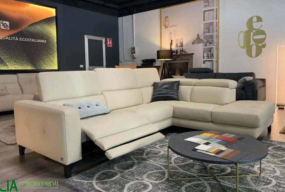 Divano Modello Matt-2 di Egoitaliano , rivestimento in pelle Bennu Pearl_8498. RELAX ELETTRICO INSERITO. Dimensioni cm. 285×221 .