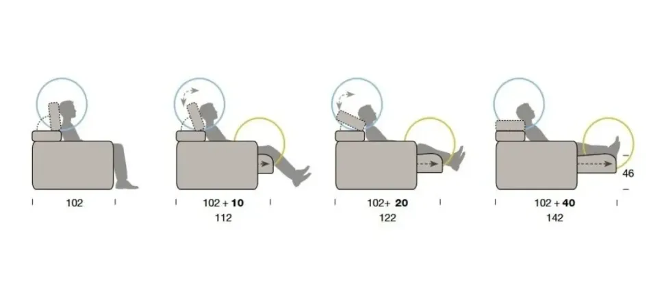 Le sedute sono ESTRAIBILI di cm 10 / 20 / 40 a raggiungere le profondità di cm 105 (sedute chiuse) / 115 / 125 / 145.