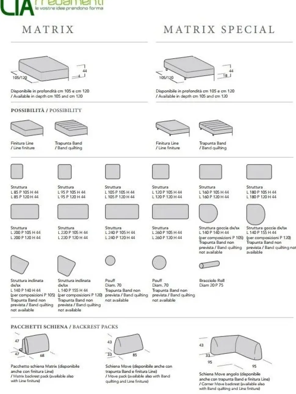 Vi presentiamo il divano Matrix Special , composto da 2 elementi da cm. 200 x 120 + 3 pacchetti schienali e 1 bracciolo a rullo , piedini di serie Round .Il costo si riferisce alla categoria A .