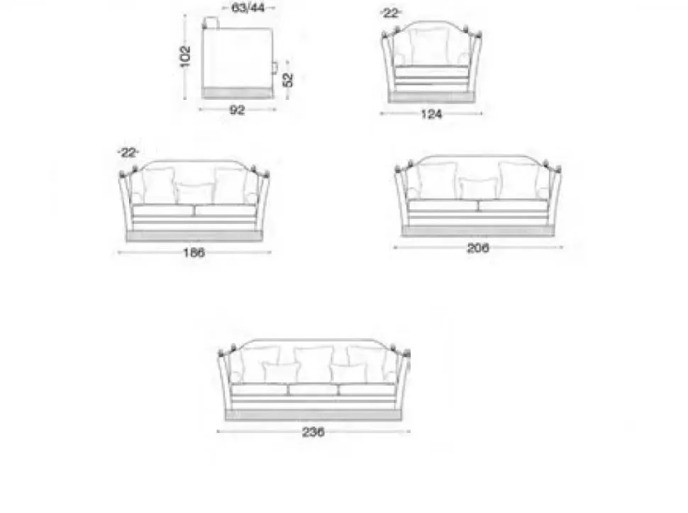 - Tipologia divani: 3 posti con seduta fissa, stile classico