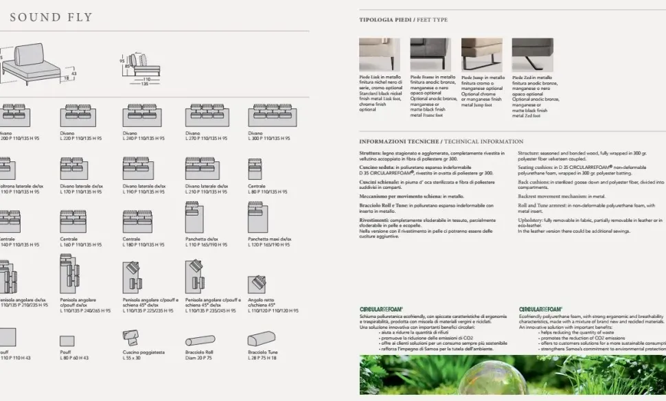 Vi presentiamo il nuovo divano mod. Sound Fly di Samoa . Ingombro della composizione presentata è di cm. 300×225 (con schienali chiusi) è comunque disponibile anche lineare e altre dimensioni . Costo con tessuto cat. A , a scelta altri tessuti e categorie . Piedini di serie modello Link in metallo nichel nero e cromo .