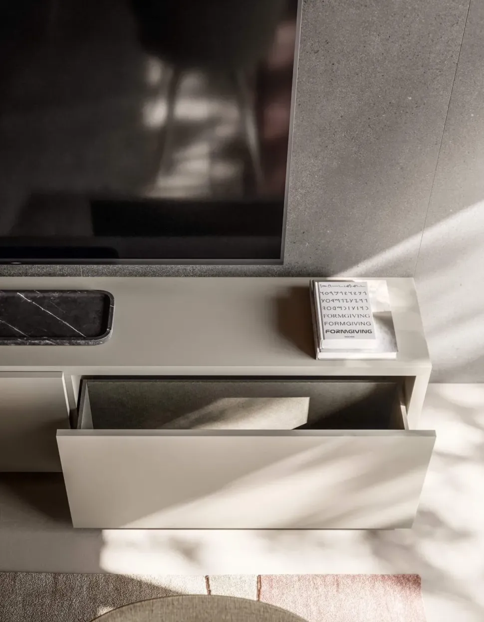 Un sistema modulare che combina geometrie di pieni e vuoti a punti luce ed estende la sua funzionalità dalle pareti fino a terra. Tonalità neutre e finiture materiche caratterizzano interamente gli elementi d’arredo, dalle schiene ai ripiani, dai frontali all’interno dei cassetti.