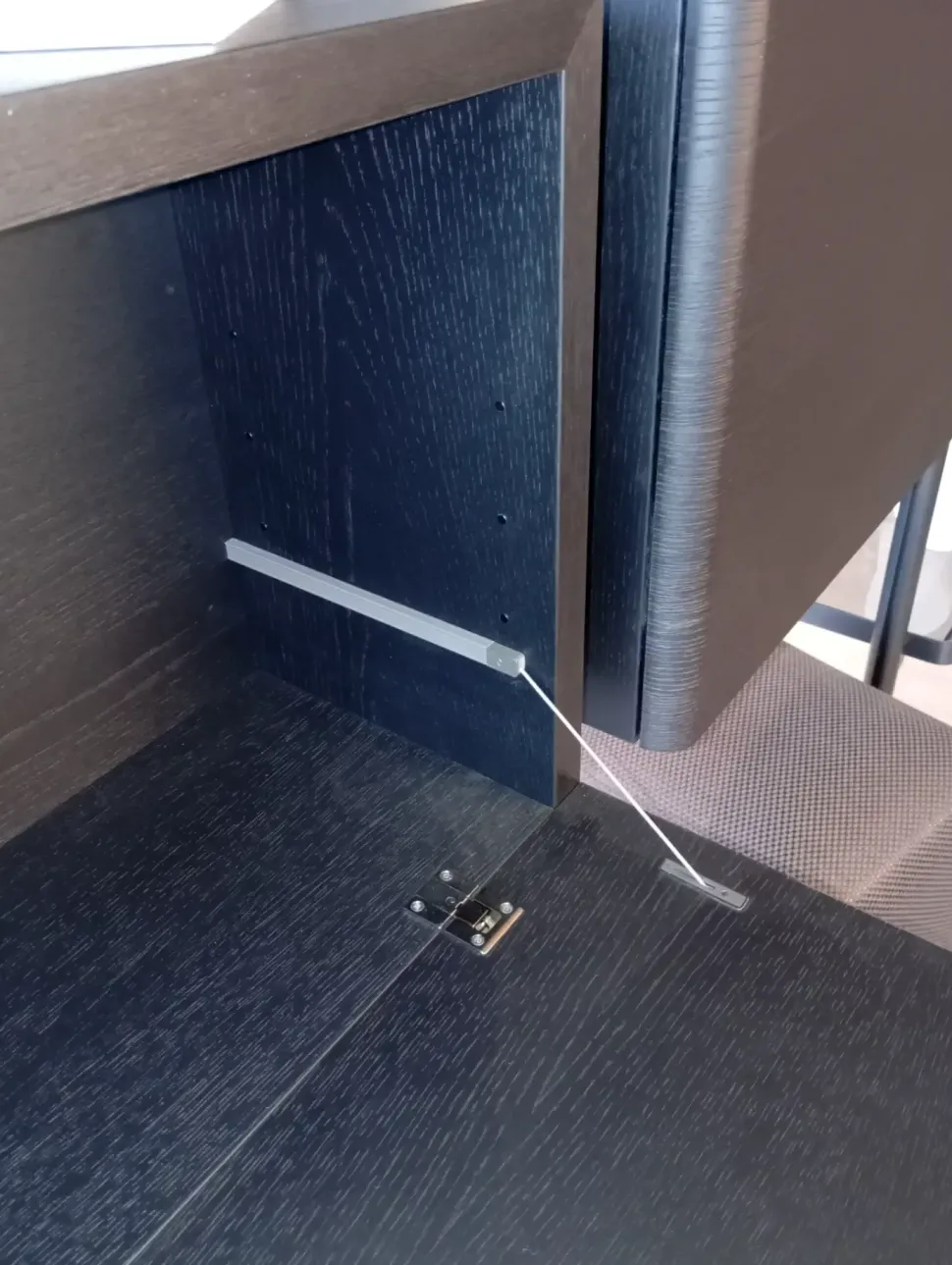 COMPOSIZIONE MODULARE HECTOR TERRA-SOFFITTO, TELAIO IN ESTRUSO D’ALLUMINIO, RIPIANI IN VETRO TEMPERATO FUME’ E CONTENITORI IN LEGNO CON APERTURA A RIBALTA, APERTURE OPPOSTE.