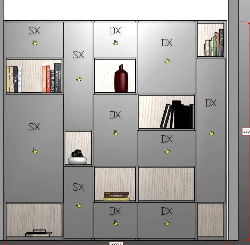 Questa libreria di design L 230 H 224 , rappresenta un perfetto equilibrio tra estetica contemporanea e funzionalità contenitiva, ideale per ambienti residenziali moderni o spazi professionali.