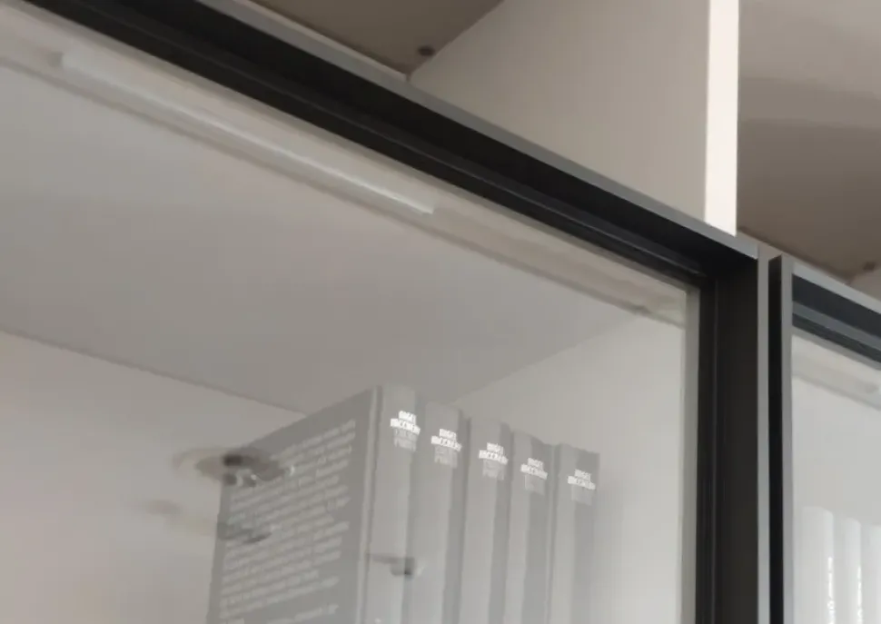 Mobile libreria Lema mod. Selecta, struttura e fondali laccato opaco Pomice, ante a ribalta ed anta battente Naica laccato opaco Basalto. Ante Dandy in vetro trasparente con telaio in alluminio nero. Moduli vetrina con ripiani in vetro e luce a led. Prodotto nuovo da esposizione. Dim: l.361,1 p.34,6 h.249,8