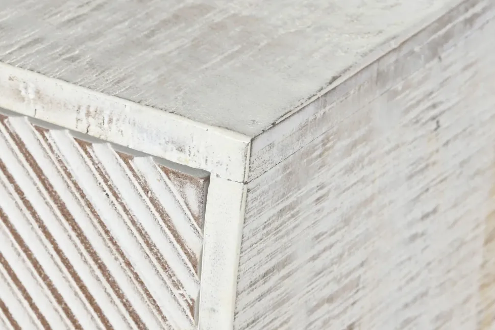 Credenza Mango Decapata 170 , credenza costruita artigianalmente in legno massello di mango, con finitura decapata bianco. Ante finemente intagliate a mano con maniglia in colore oro. Composta da 4 ante con mensola interna.