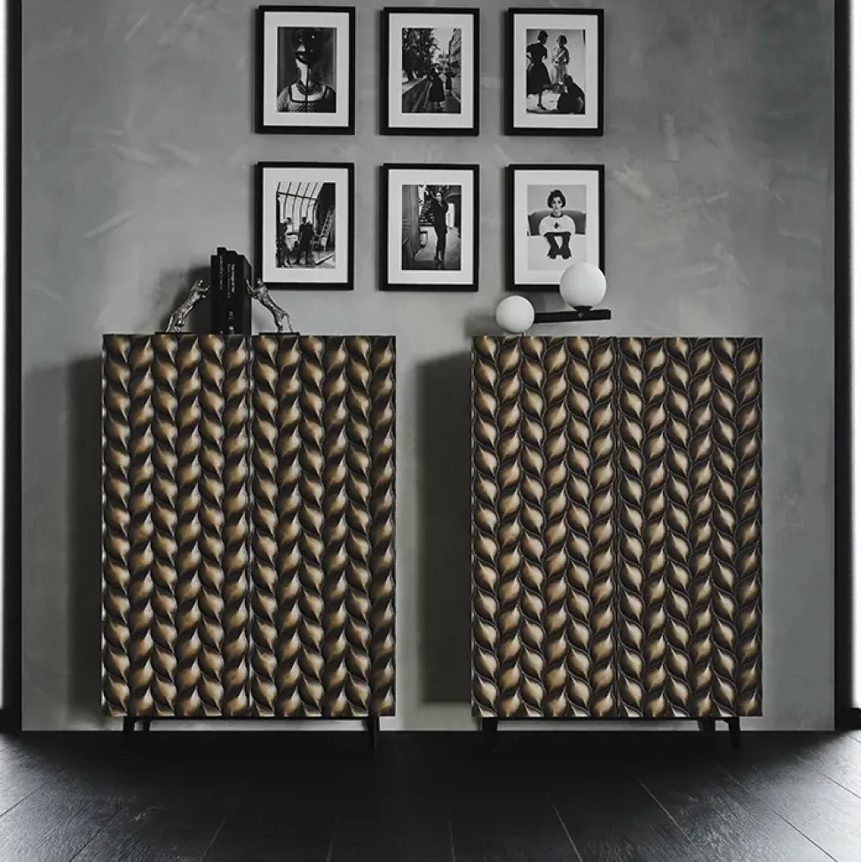 Disponibile con ante Brushed Bronze o Brushed Grey, piedini in acciaio verniciato goffrato graphite (GFM69) o nero (GFM73).