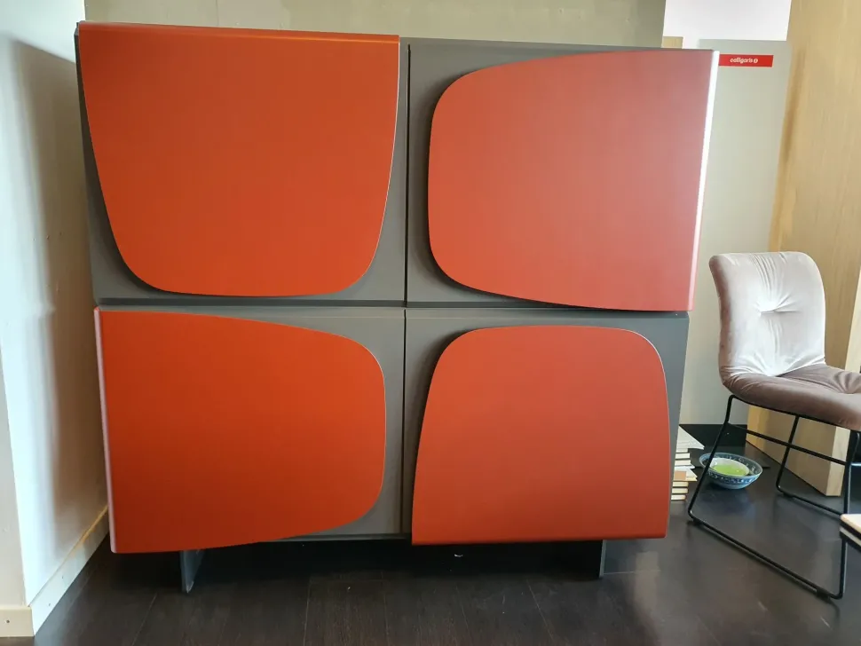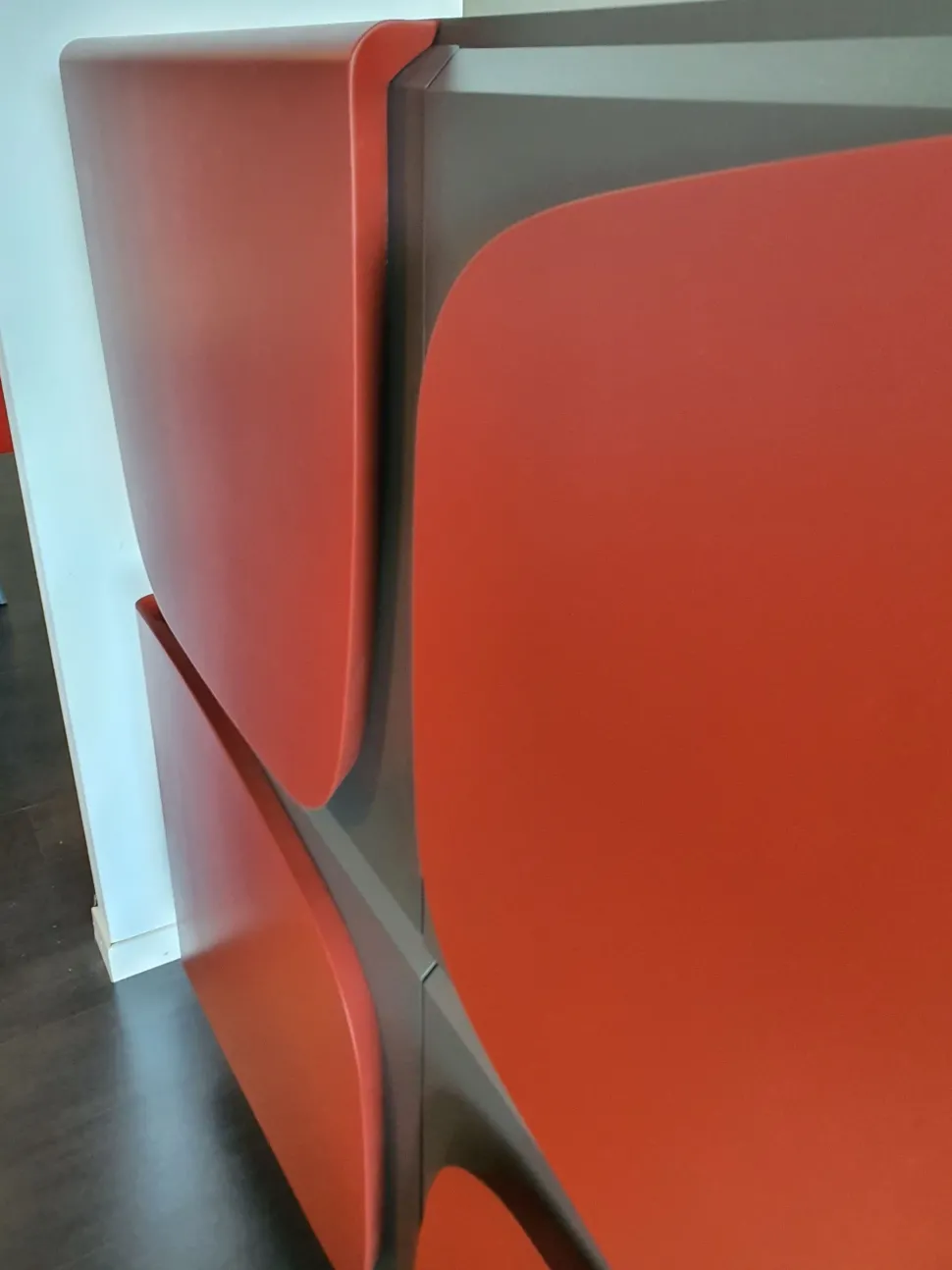 La struttura è in laccato opaco colore ardesia mentre i particolari frontali sono caratterizzati da forme tondeggianti di color mattone. Questi inserti fanno da presa per aprire comodamente le antine