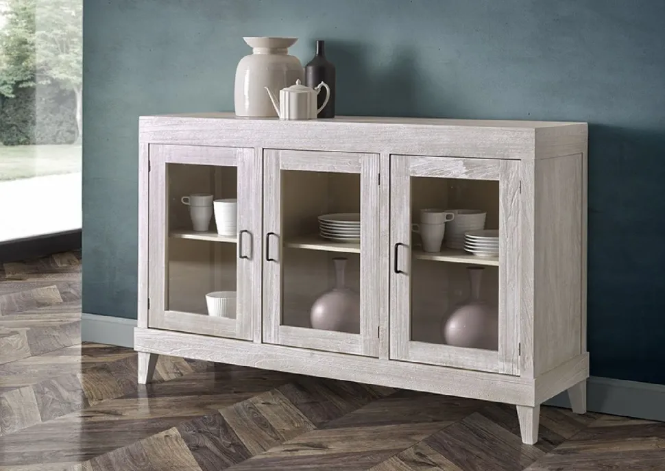 Madia 3 ante vetro in legno massello finitura grigio patinato L153 cm H 103 cm P 46 cm