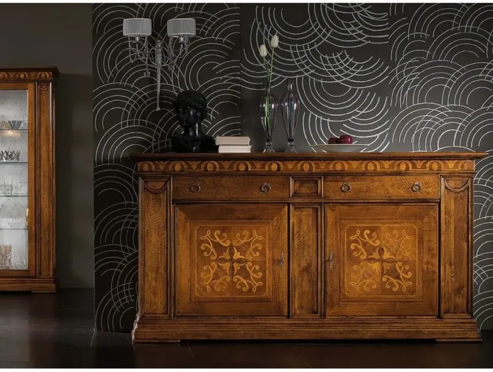 Madia artigianale prodotta in noce massiccio a 2 ante e 2 cassetti con intarsi, le misure sono; L.223 H.120 P.55.