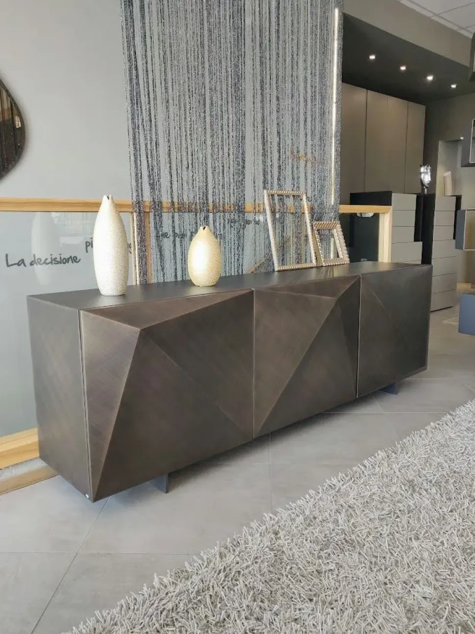 Kayak madia con ante particolare e piedini in verniciati grafite di Cattelan Italia, disegnata dal noto designer Andrea Locatello. La credenza moderna con tre ante diamantate che la rende molto elegante oppure nella versione da due ante per ambienti più razionali.