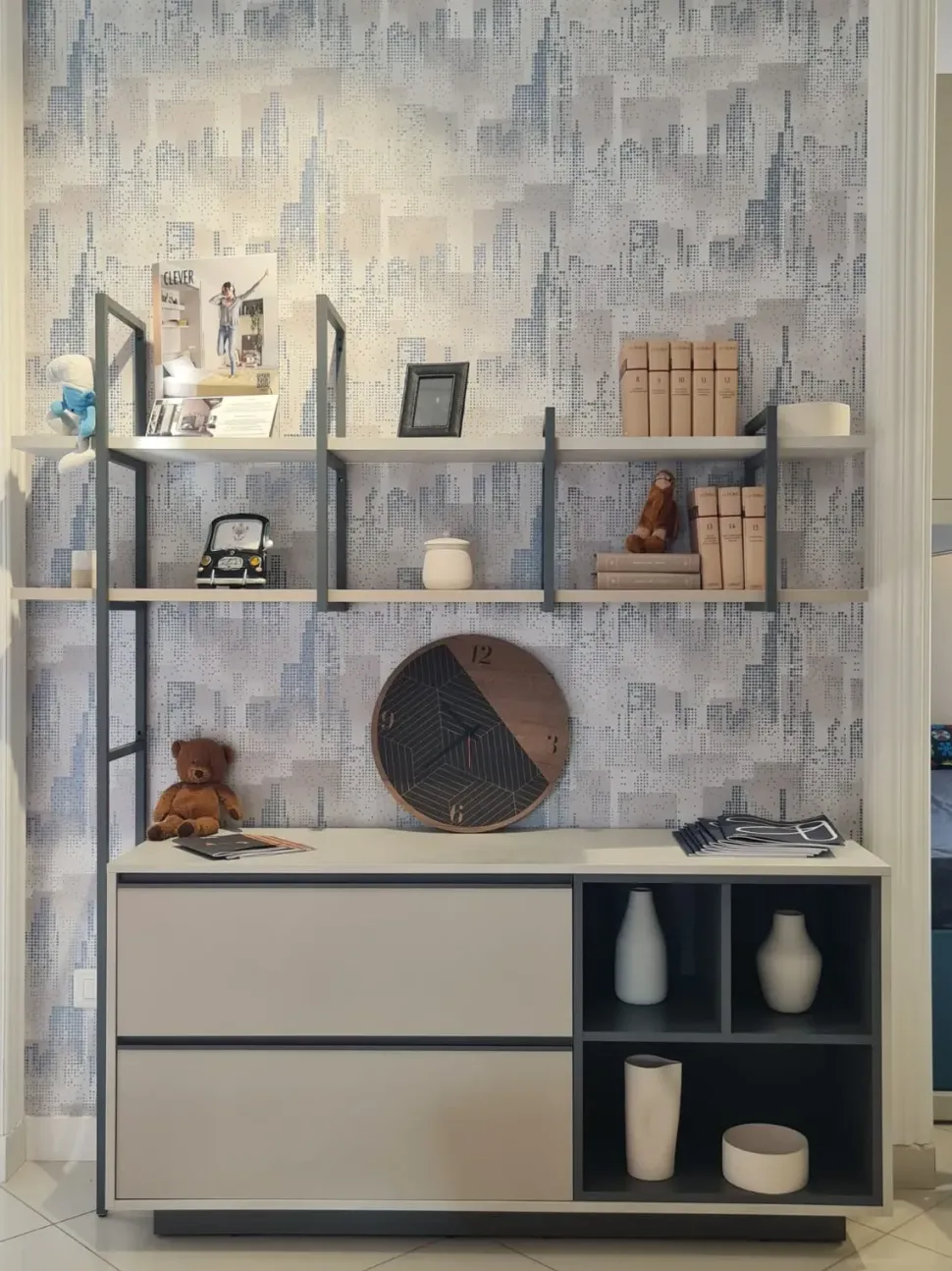 Composizione madia zona giorno con cassettoni e blocco a giorno, corredato da sistemi mensolari .