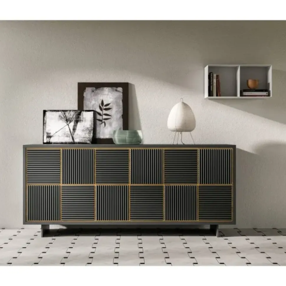 Il frontale, della madia Queen, gioca sui volumi, sulle geometricità e sulla pulizia delle linee, il che crea una certa impressione di movimento, senza mai trascendere. Queen, è la soluzione ideale per una zona living moderna, calda e accogliente, ma anche per altri ambienti meno scontati. Nella versione Antracite il telaio delle ante è sempre Oak.