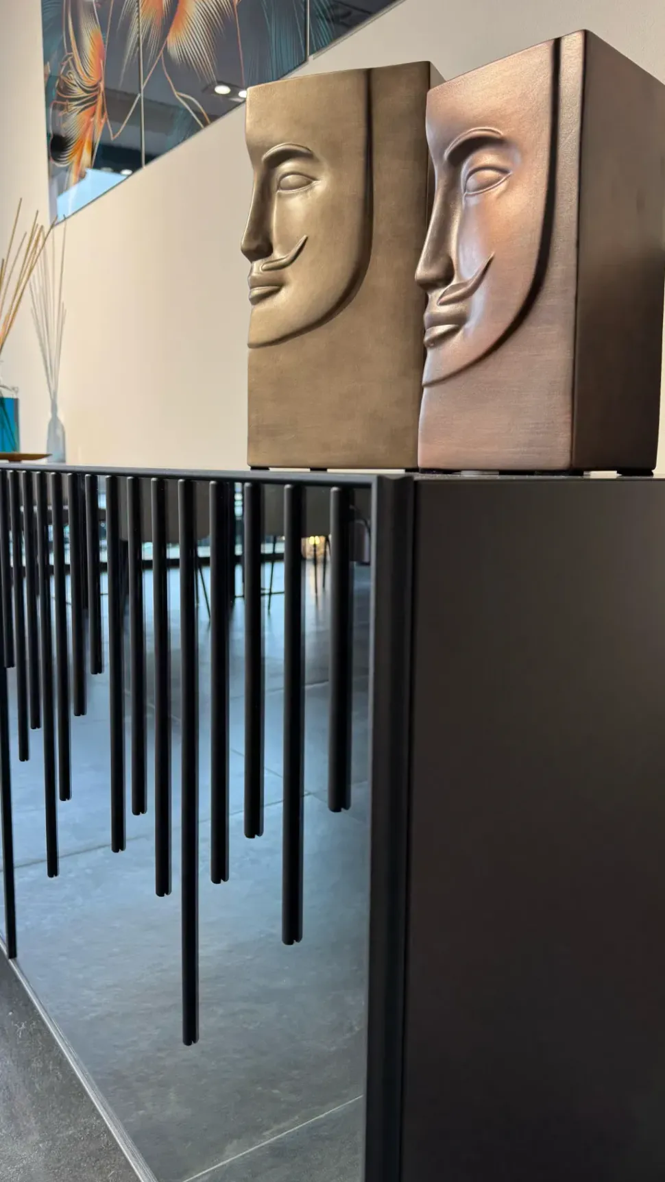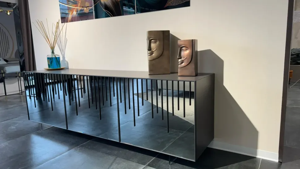 Rain è madia disponibile in versione 2 o 3 ante, contenitore laccato, rivestimento ante con motivo a listelli in legno su fondo specchio bronzo o fumè. Listelli in legno nelle finiture noce canaletto o rovere wild carbone. Cornice e telaio delle ante in alluminio verniciato e piedini in vetro o metallo disponibili in due altezze, 10 e 20 cm.