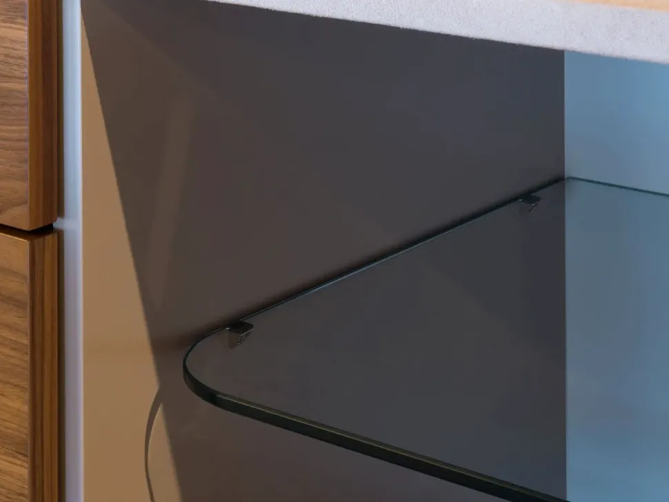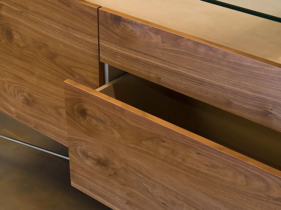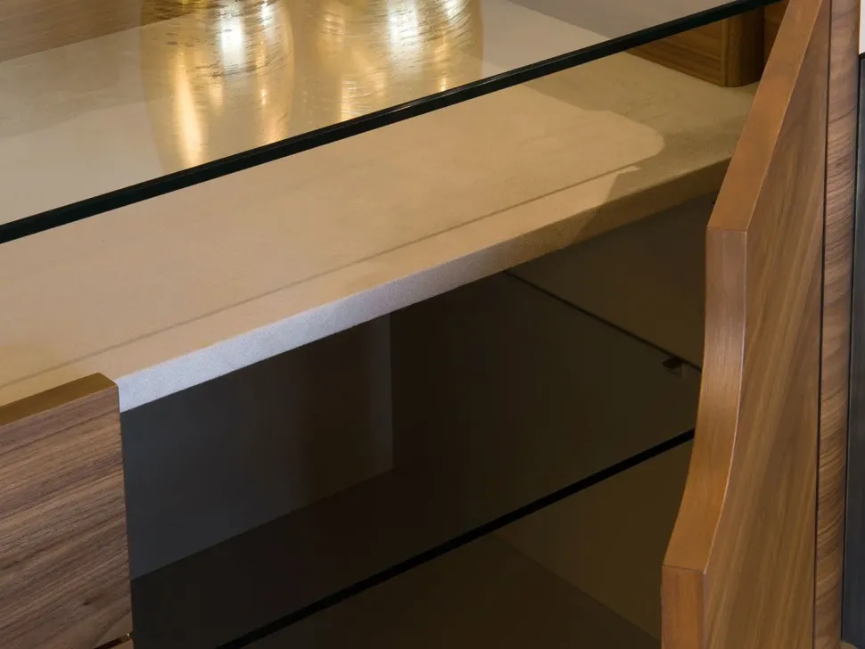 La credenza / comò prevede due ante laterali e due cassetti centrali con chiusura a richiamo frenato; il top è in vetro e lascia a vista un vano a giorno rivestito in tessuto, pensato come espositore per oggetti da collezione e di valore o per riporre gioielli o piccoli accessori. Particolare è il taglio curvo delle ante che rivela il vano a giorno sottotop e funge da presa per l’apertura.