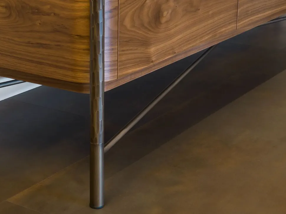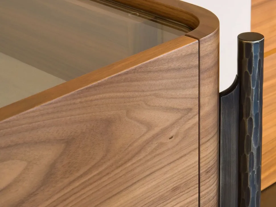 La struttura in legno con spigoli stondati è sostenuta da elementi verticali in metallo forgiato e sfaccettato che si innestano ai quattro angoli e si raccordano alla base in una sorta di cavalletto. Le ante svelano gli interni laccati, divisi da un ripiano in vetro sagomato molato a filo lucido.