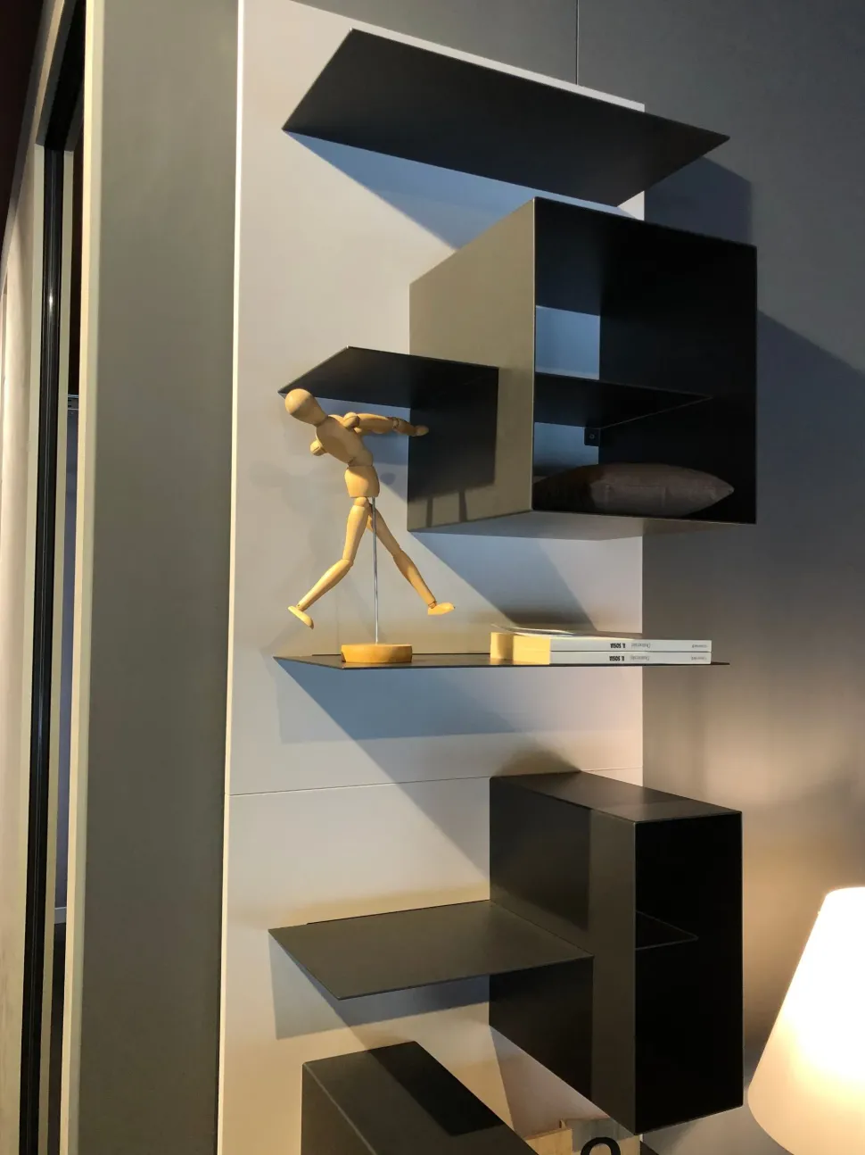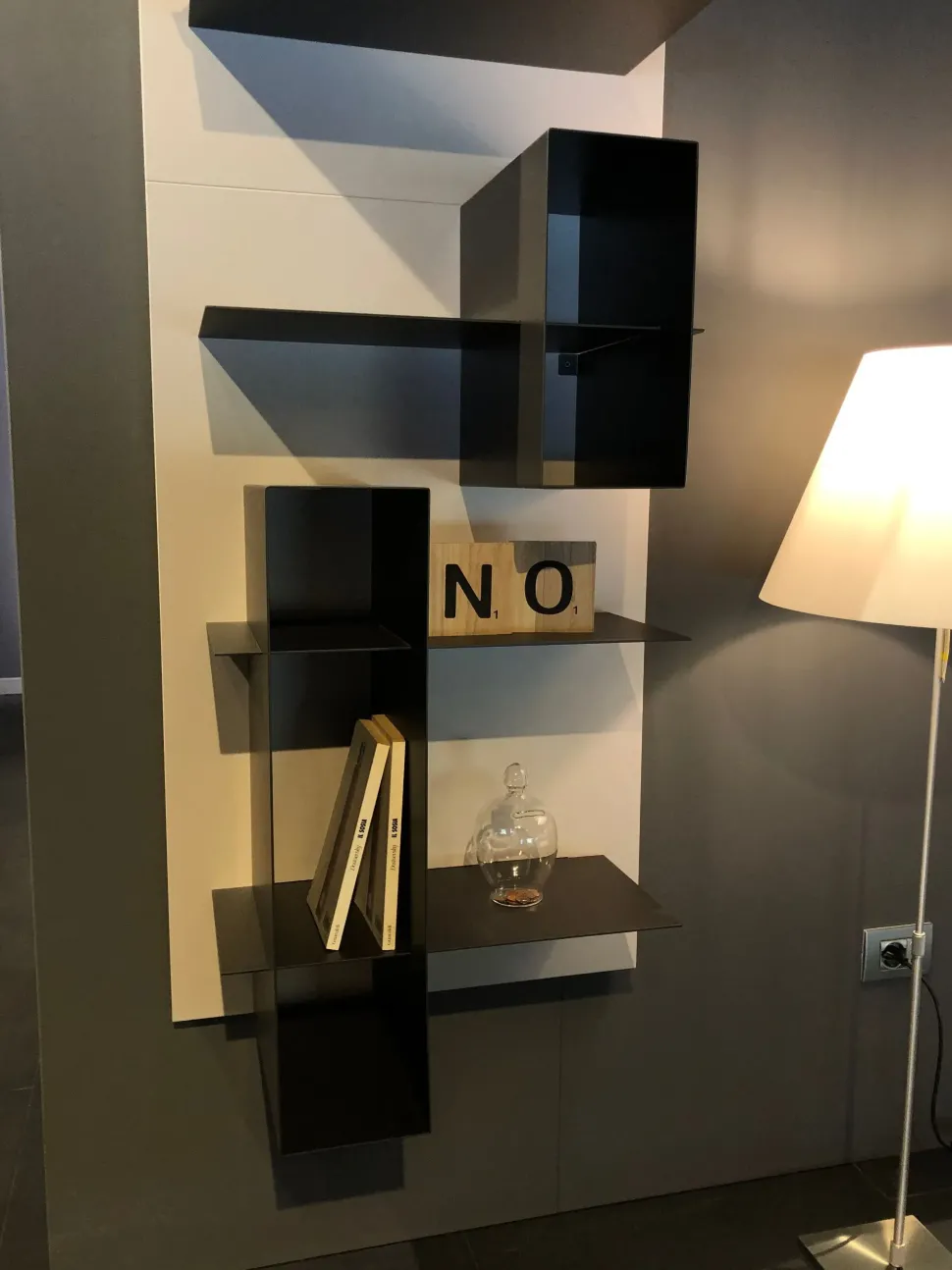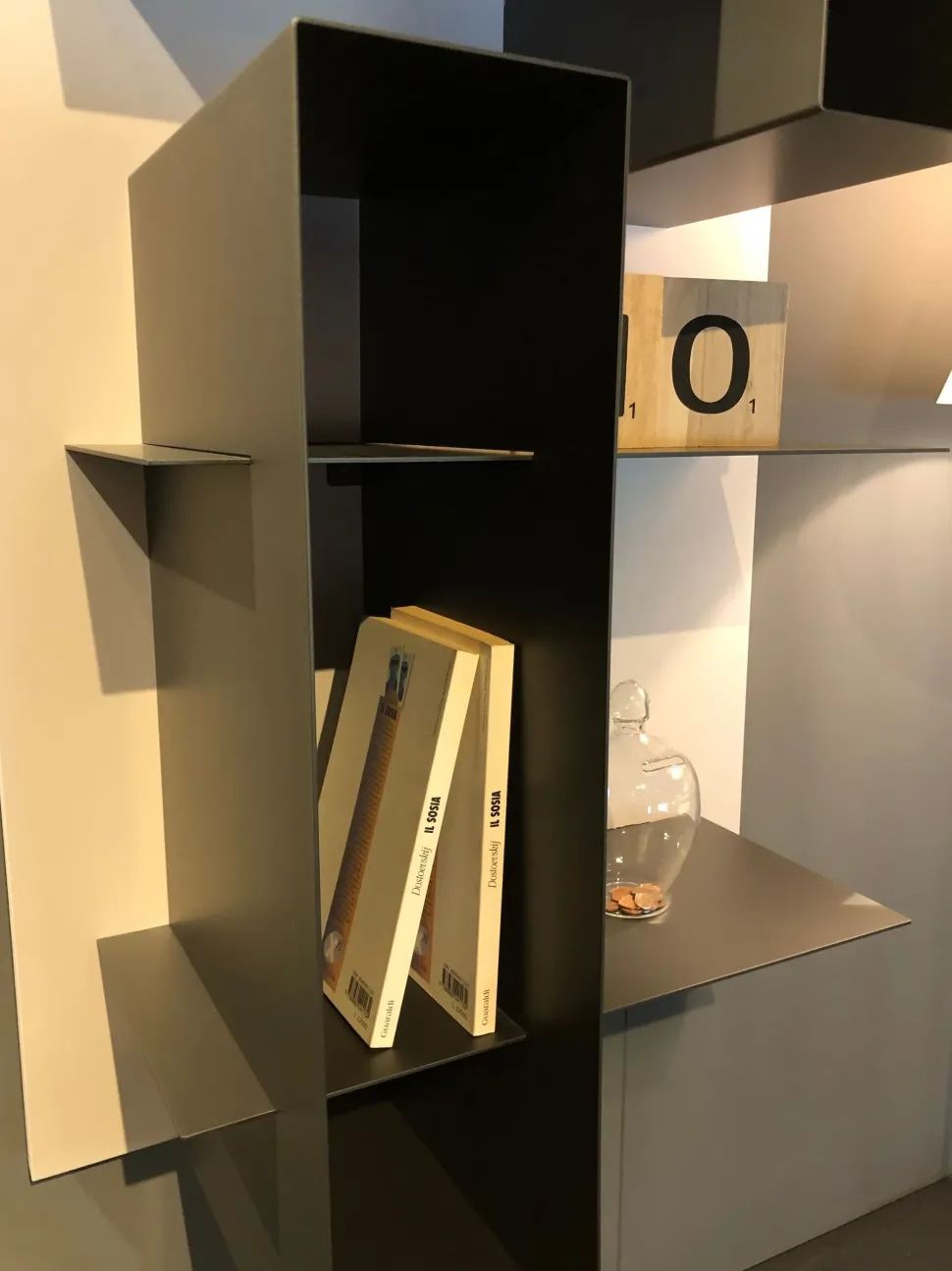 Pannelli boiserie in finitura duna, con mensole in metallo in finitura piombo + Box in metallo di misura variabile, SP.2 mm, in finitura piombo.