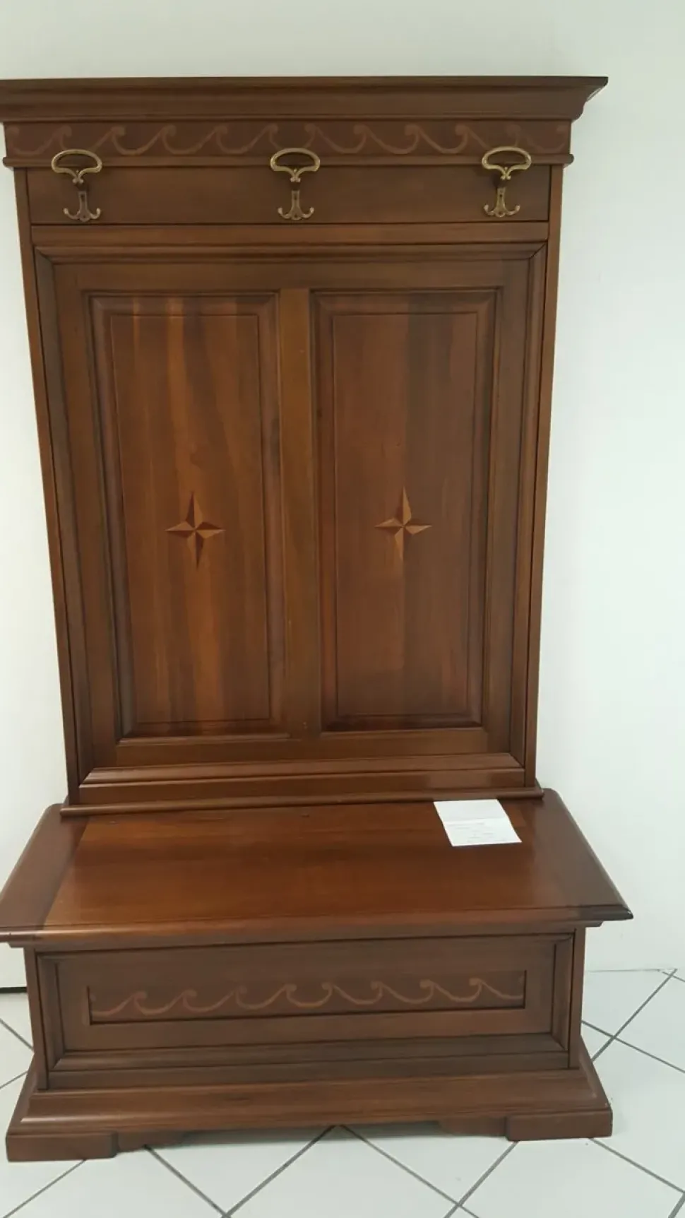 Pregevoli sono le lavorazioni che si possono trovare nel frontone della cassapanca, che viene ripetuta anche nell’ultima cornice sopra agli attaccapanni, e quelle che si trovano collocate negli schienali della zona appeso.
