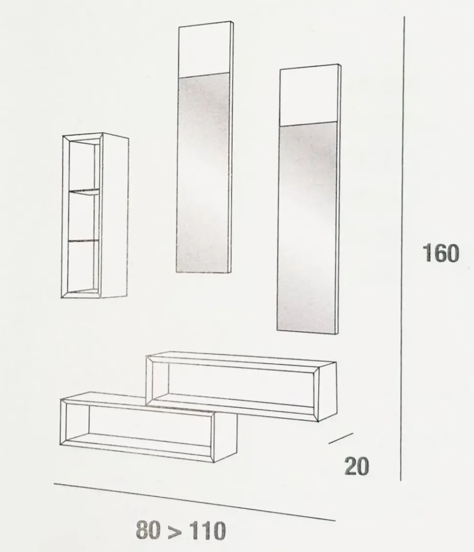 Composizione formata da 2 vani giorno orizzontali da 60*h17 profondi 20 cm, un elemento verticale delle stesse misure ma con 2 ripiani in vetro e 2 specchiere da 89*20 su pannello in tinta con i mobili.
