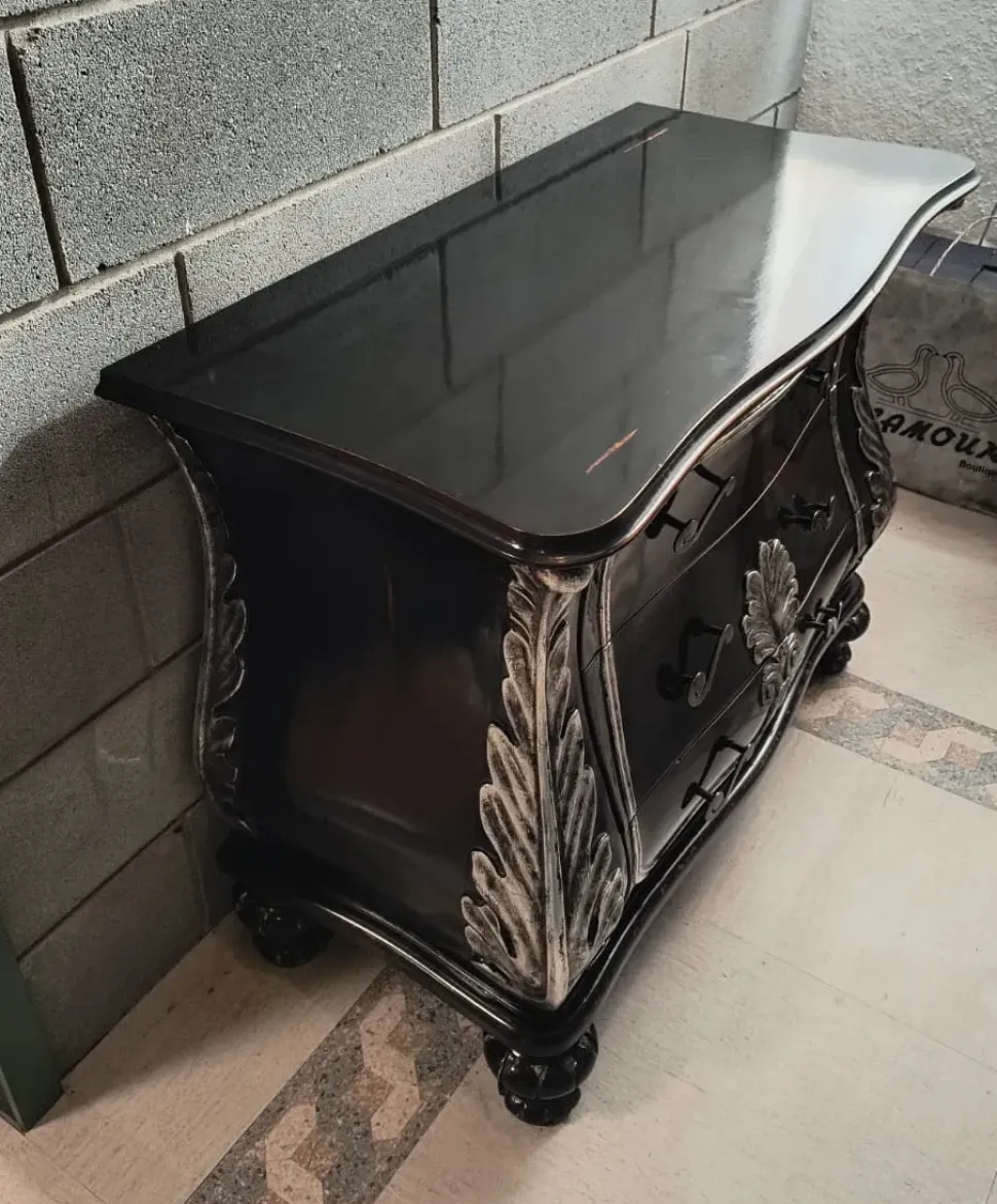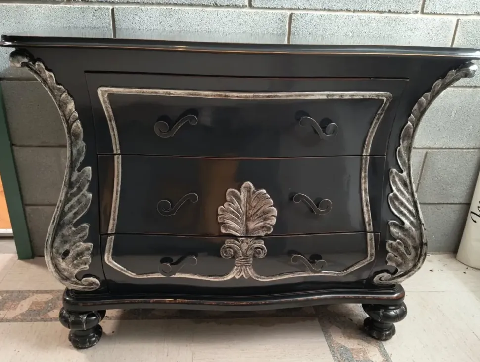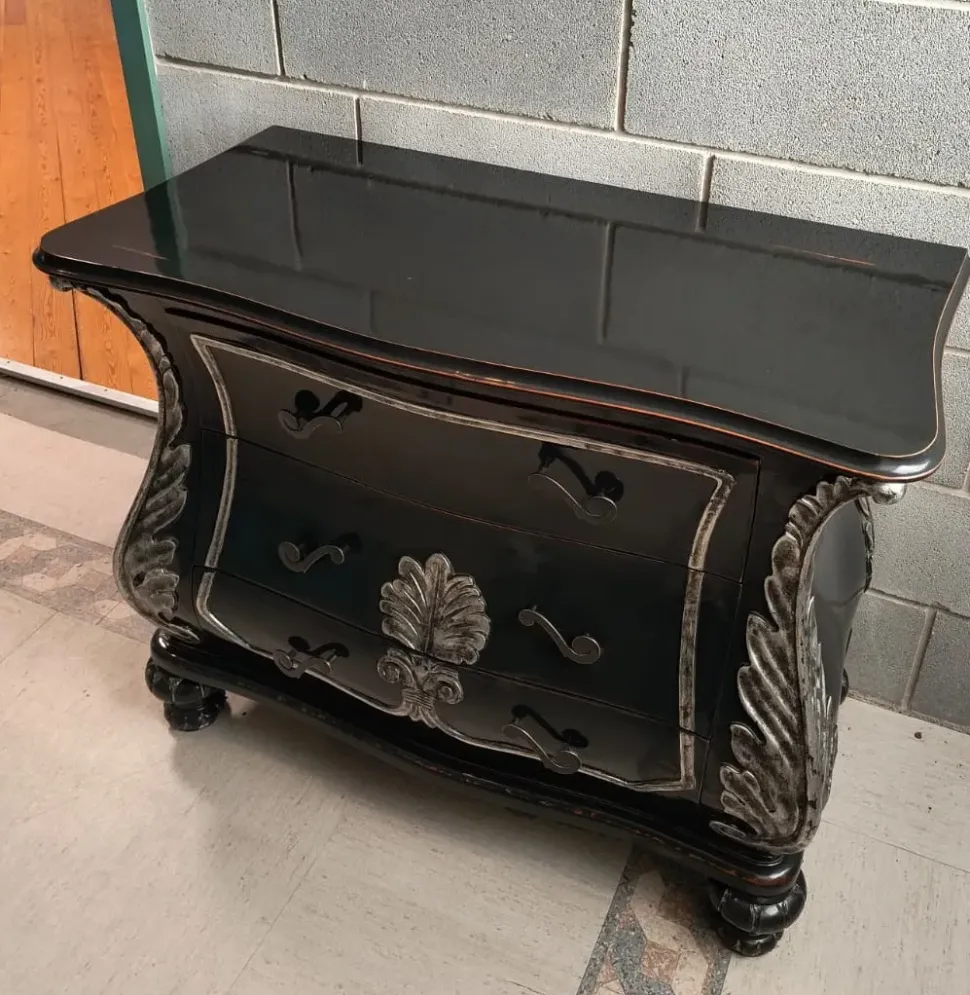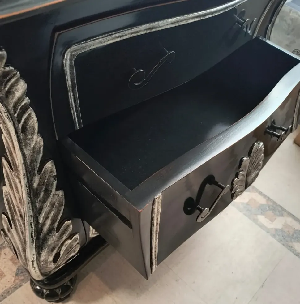 Mobile da ingresso artigianale , completamente massiccia e intagliata a mano , laccata liquerizia con dettagli in foglia argento patinata , misure 97x48x75h ,ULTIMO PEZZO DISPONIBILE