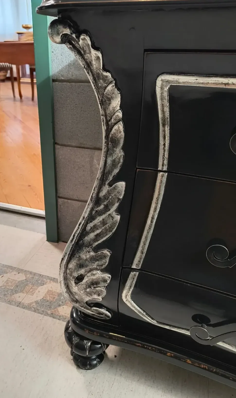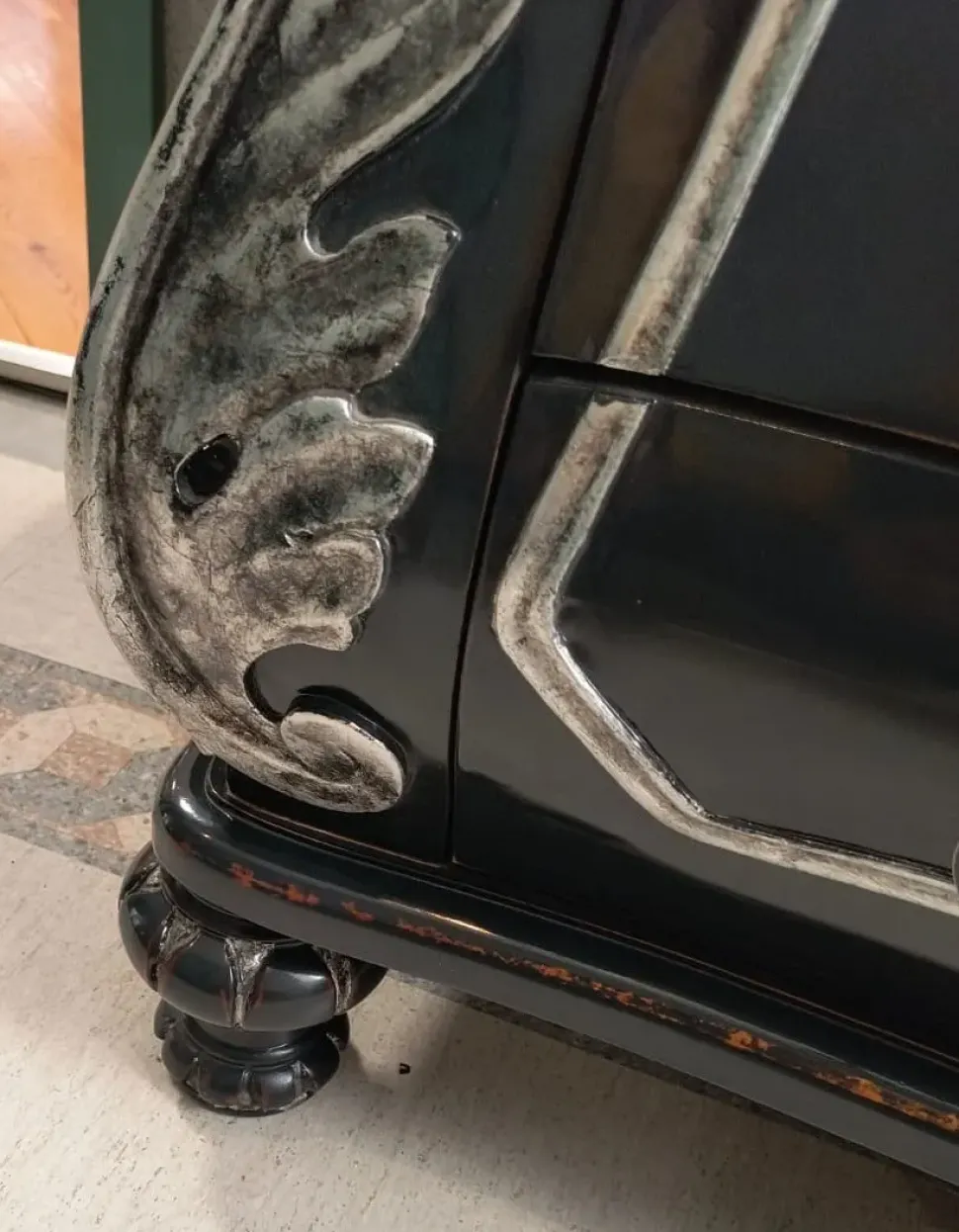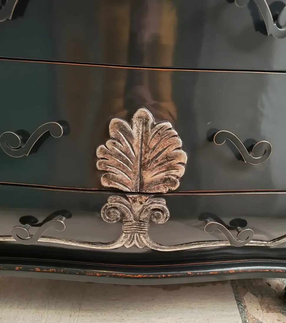 - Finitura: Laccatura color liquerizia con preziosi dettagli in foglia argento patinata