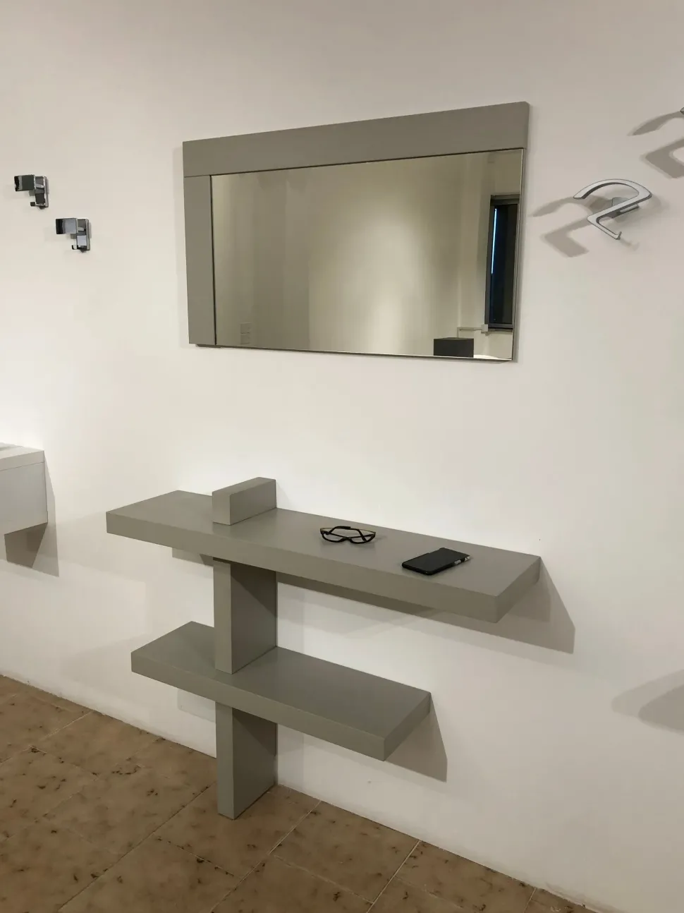 Composizione formata da mobile consolle a muro “F” (110*92*28), specchio (93*53) + 2 appendiabiti a muro.