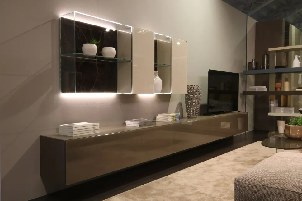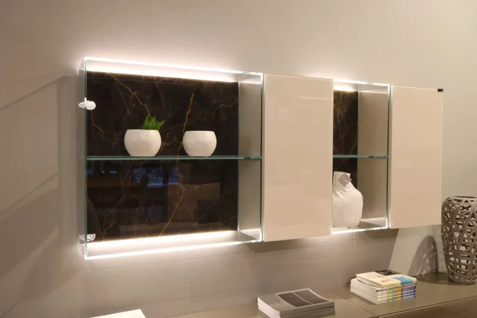 Un design unico e materiali di qualità caratterizzano tutte le pareti attrezzate del noto e conosciuto brand: il modello in foto, per esempio, è in vetro.