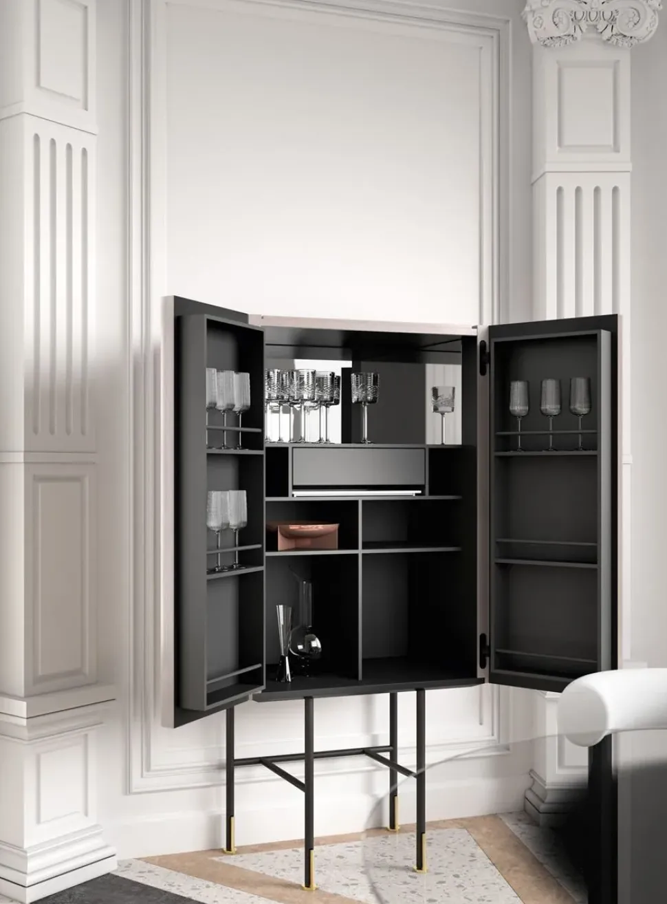 Aero è un elegantissimo mobile bar a due ante con finitura ottone vintage ed interni salvia. I colori e la trama verticale rendono questa elegantissima madia una reinterpretazione in chiave moderna dei mobili bar anni ’30. La struttura interna è pratica e contenitiva e permette di posizionare con grande agio bottiglie, vassoi e bicchiere di qualsiasi dimensione. Un articolo perfetto per stupire, con eleganza e praticità, i vostri ospiti. dimensioni: Larghezza 73 cm – altezza 152 cm – profondità 45,5 cm