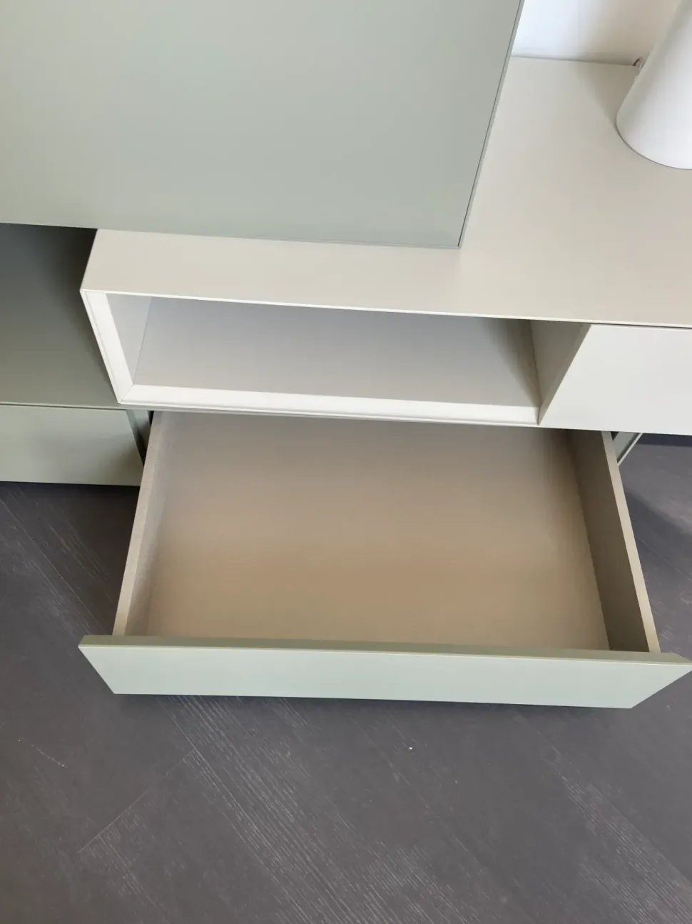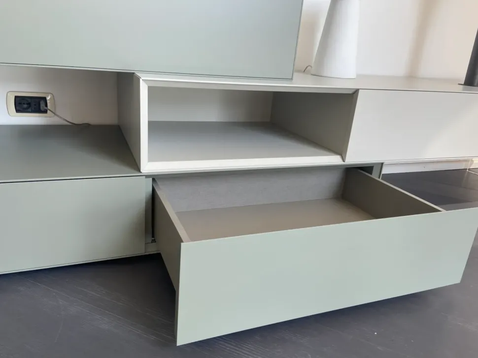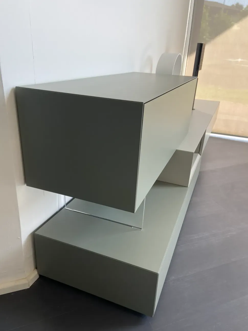 - La prima dal basso è una base a terra composta da due cassetti con apertura push-pull (spingi porta) ed è in laccato opaco verde salvia. Misure: l.150 h.22,5 e p.54,6 cm