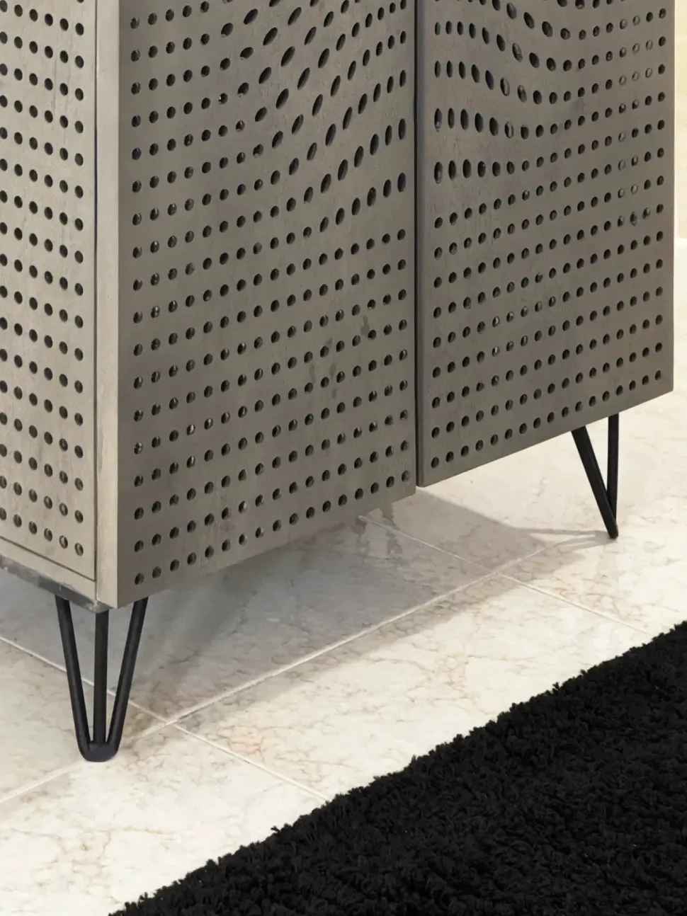 Credenza Ela in legno di mango massello su piedini in metallo in finitura è di colore grigio con una particolare lavorazione che riproduce un elegante effetto ottico.