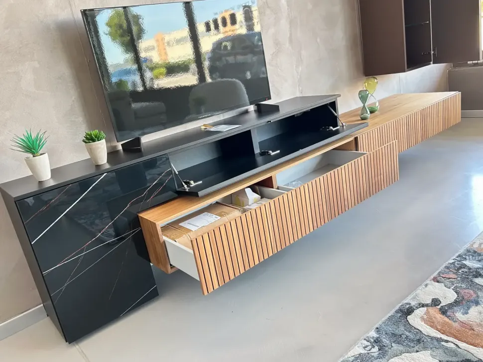 Per completare un living moderne scegli una parete attrezzata che mantenga una certa coerenza di stile, come questo modello Parete tv a prezzo ribassato.