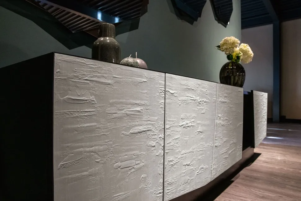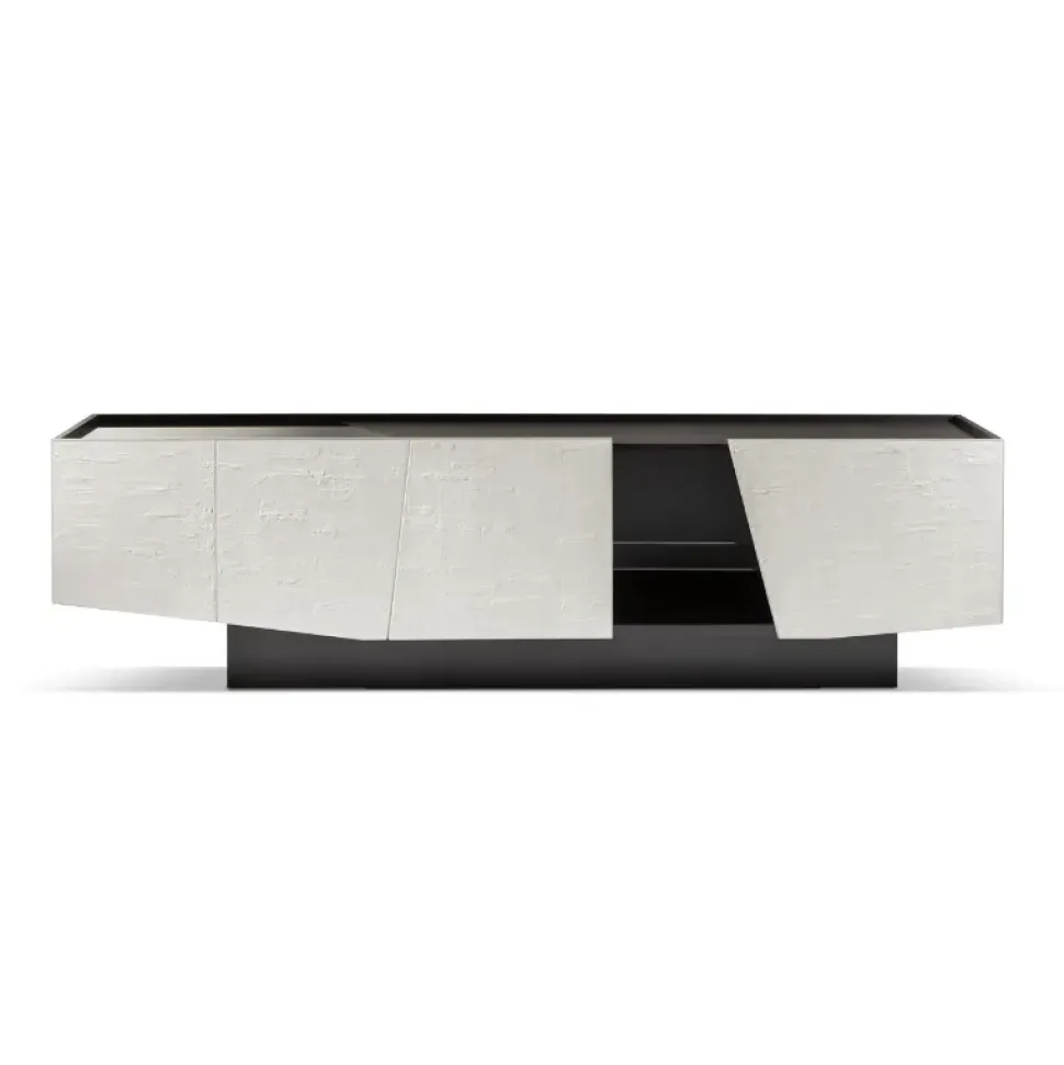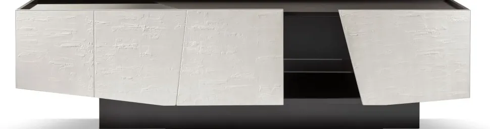 Il piano è costituito da un vetro serigrafato nero sagomato, incastonato sul legno. Il frontale delle quattro ante, come un’opera d’arte, sono impreziosite da una sofisticata decorazione, mentre il loro perimetro, dalla geometria irregolare, è definito da un bordo verniciato. Interni in tinta e ripiani in vetro sagomato molato a filo lucido. La linea delle ante è interrotta da un vano a giorno. La decorazione e la finitura delle ante può essere scelta tra le numerose proposte Cantori.