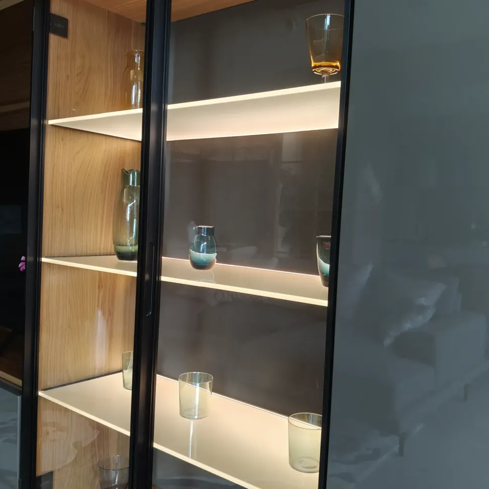 Le ante in vetro trasparente con telaio in alluminio laccato nero aggiungono un tocco di eleganza contemporanea, I ripiani in vetro satinato retroilluminati creano un atmosfera calda e accogliente.