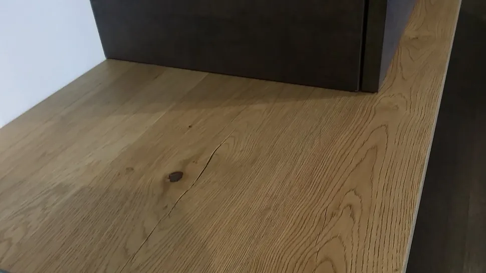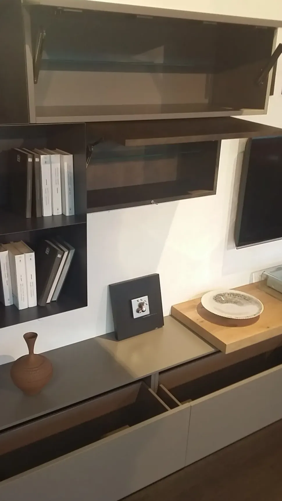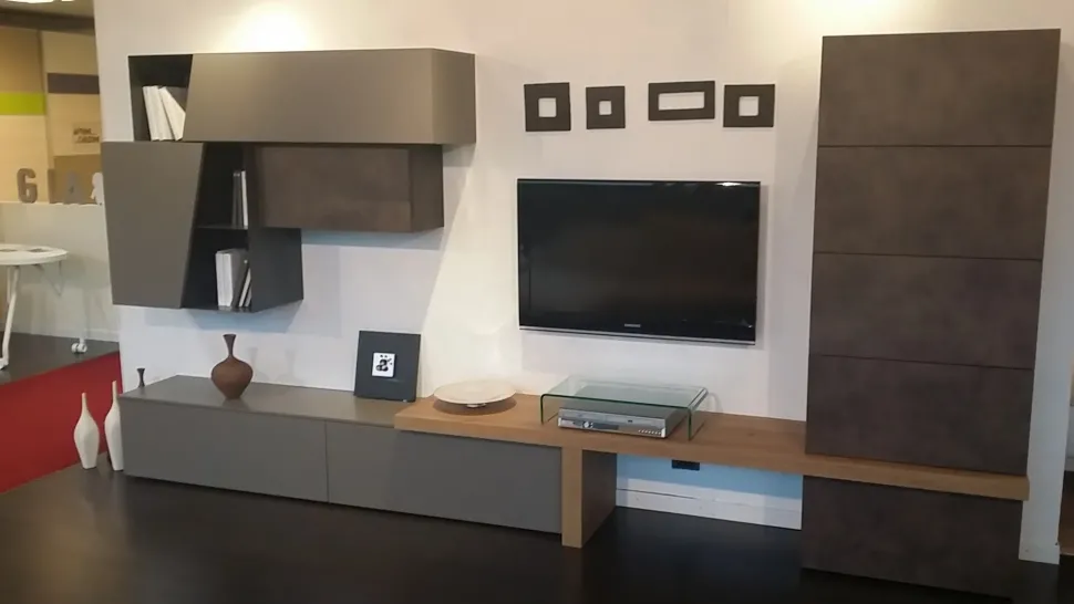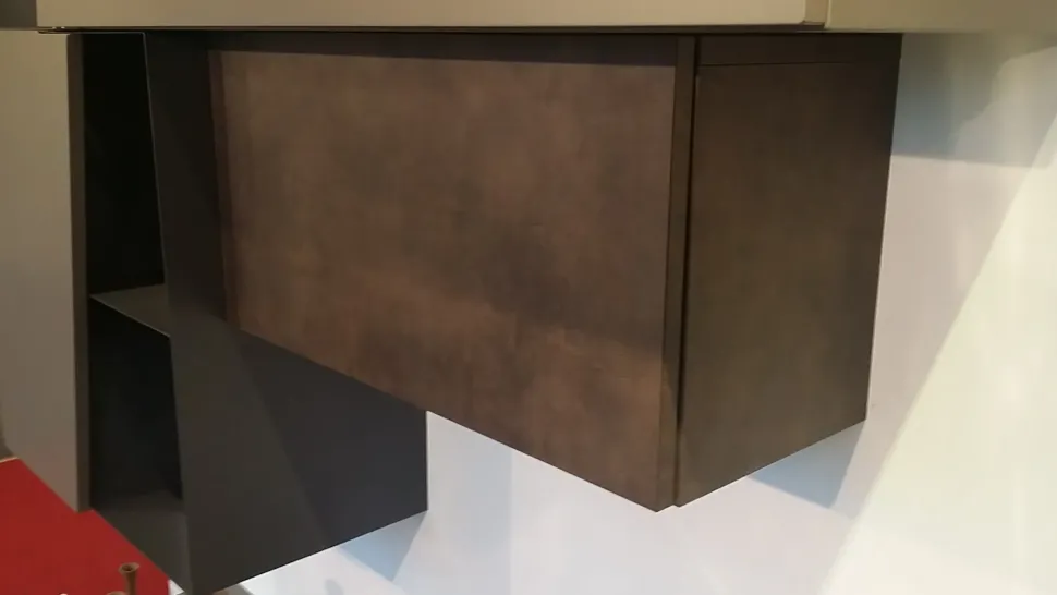Gli elementi che compongono la composizione sono in diverse finiture e vanno dal materico Maya Bronze al metallo laccato opaco Antracite al legno di Rovere nodato e al laccato opaco colore Piacenza.