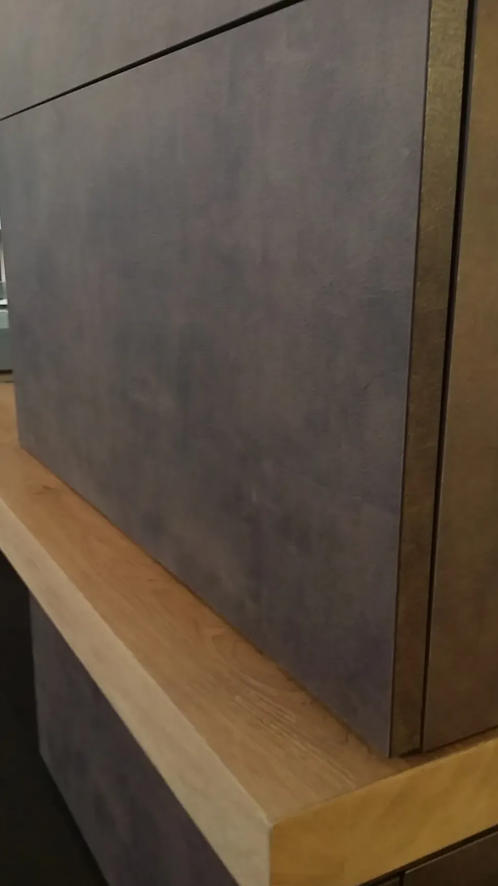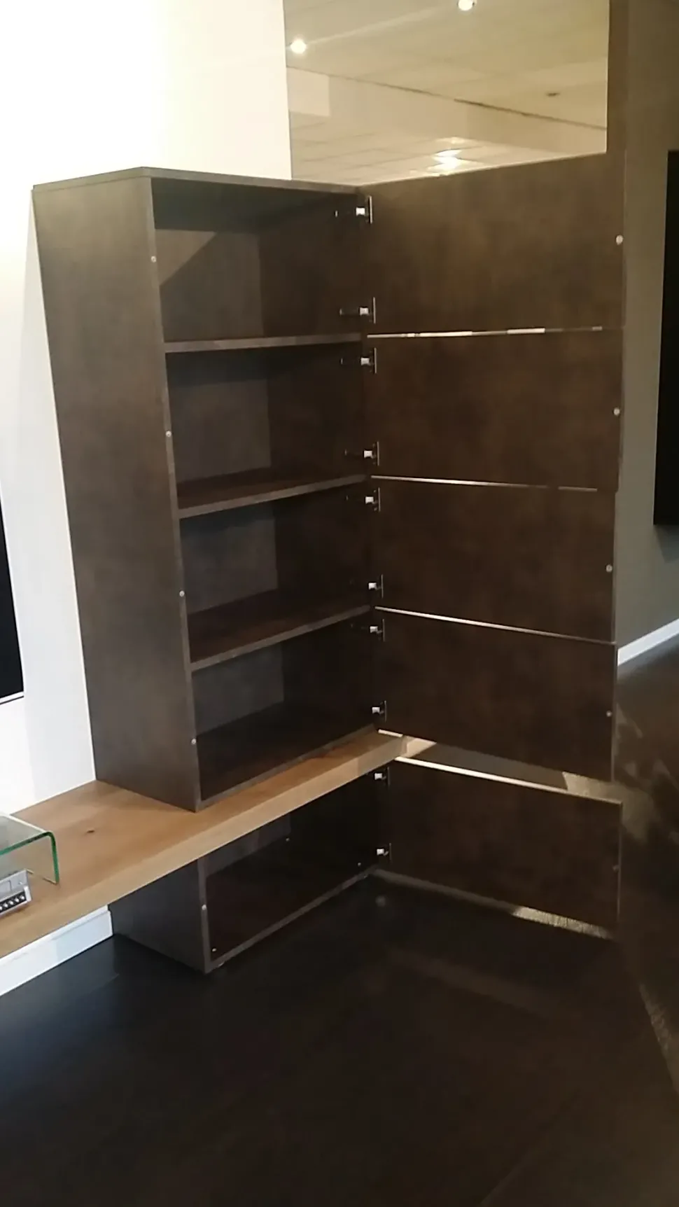La caratteristica dei pensili con taglio diagonale ed il totem verticale rende unica questa composizione che offre tanto contenimento senza rinunciare all’estetica, misura d’ingombro cm. 378×30-47prof.x207h. ca