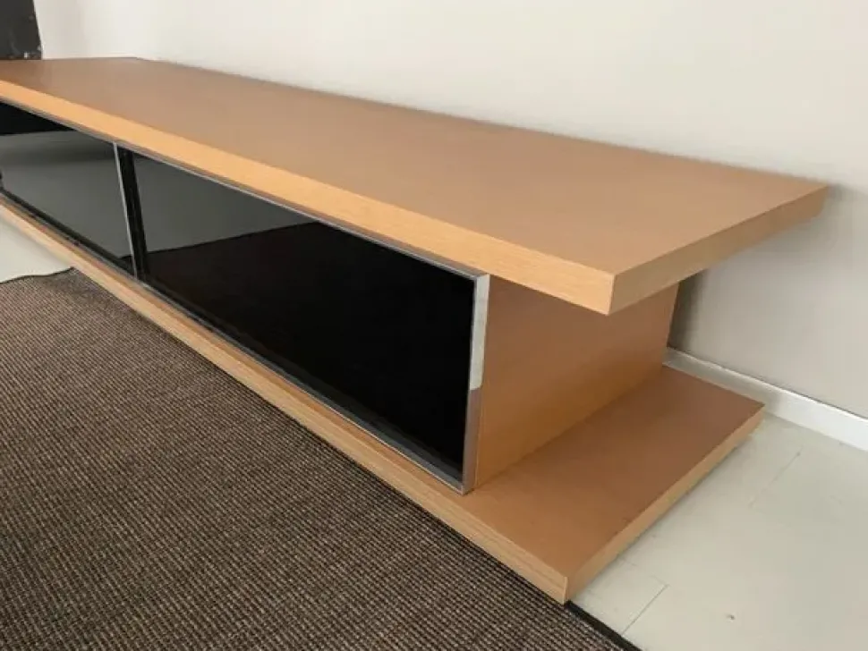panca Molteni in legno noce canaletto con cassetti in vetro nero lucido e cornice in acciaio cromato.