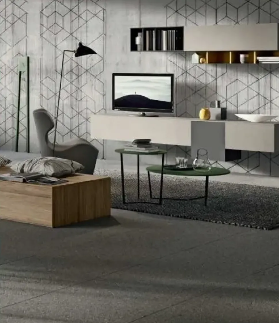 - La composizione per la zona giorno qui visibile è costruita in materiali di prima scelta e che resistano negli anni: questo modello, in particolare, è in laminato materico.