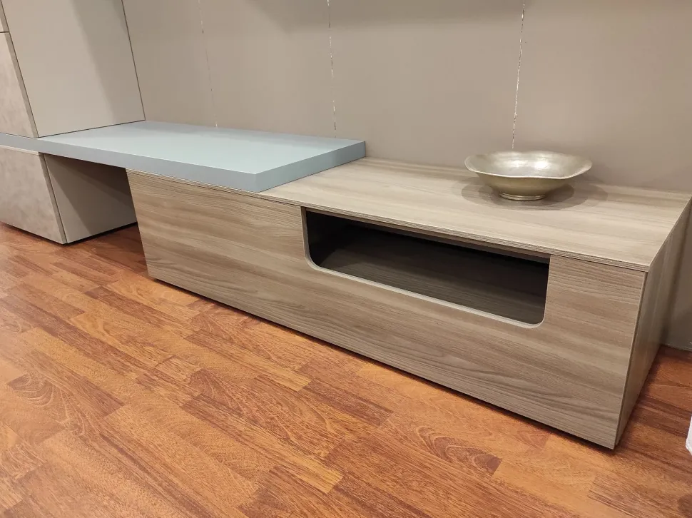 - La soluzione per il soggiorno qui presente è realizzata in materiali durevoli e resistenti nel tempo: questo modello, in particolare, è in laminato opaco.