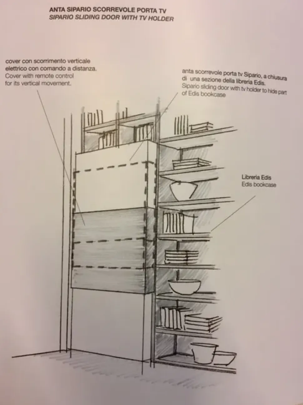 Dimensioni cm. 420 in lunghezza , Altezza cm. 229 , profondità’ cm. 36 per la spalla , cm. 39 alle ante in battuta , cm. 46 all’anta scorrevole che contiene il televisore a scomparsa.Prodotto innovativo, ricco, capiente e multifunzionale , adatto per un soggiorno o un ufficio di alto livello.