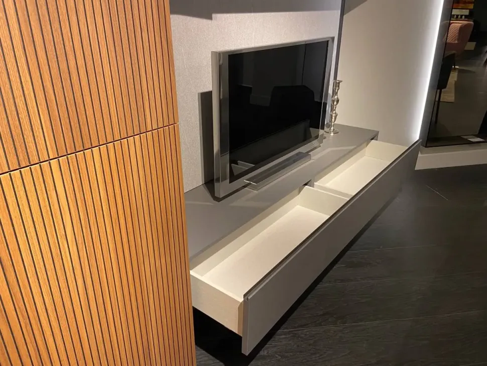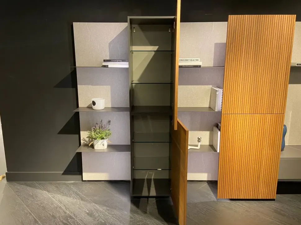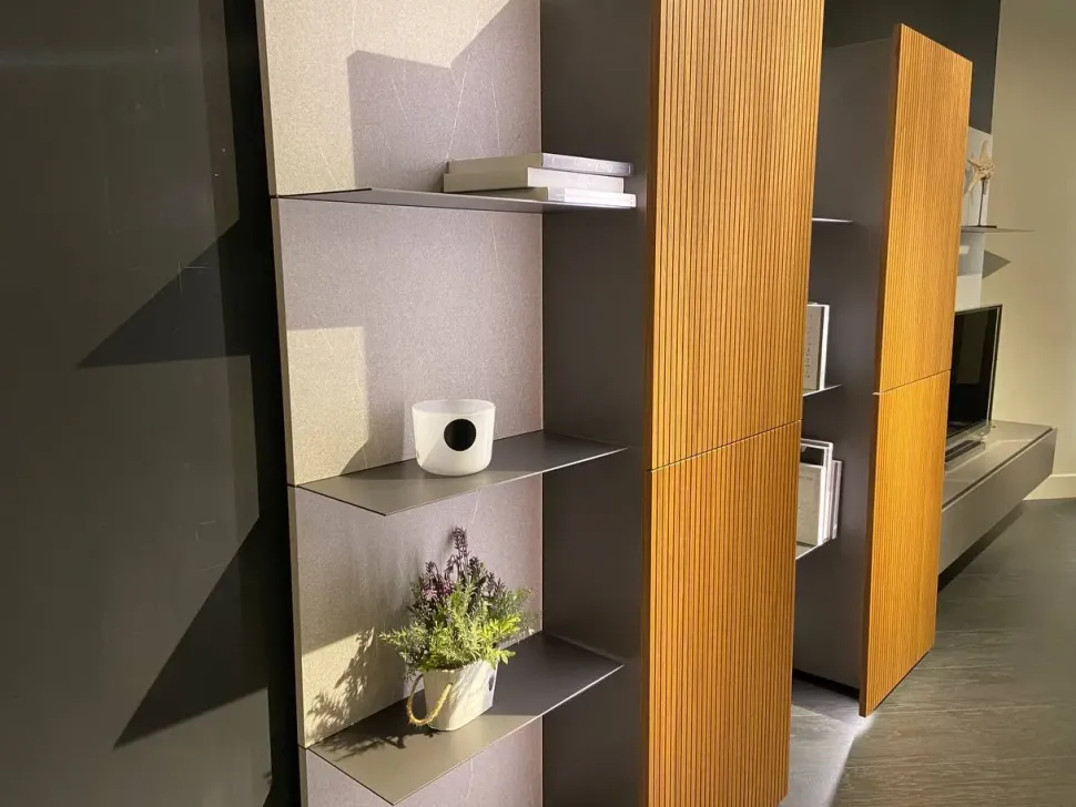 Schienali in finitura col. piasentina con mensole in metallo; Colonne con struttura col. piombo liscio e frontali in groove col. noce naturale (030g); contenitore a ribalta sotto TV col. piombo liscio; interni con mensole in vetro; luci LED incluse