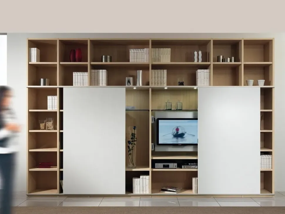 Il modello Parete-attrezzata mod.delo in tamburato scontata del 30% in foto ha una larghezza che va da 401 cm in su, risultando dunque ideale per locali di diverse misure.